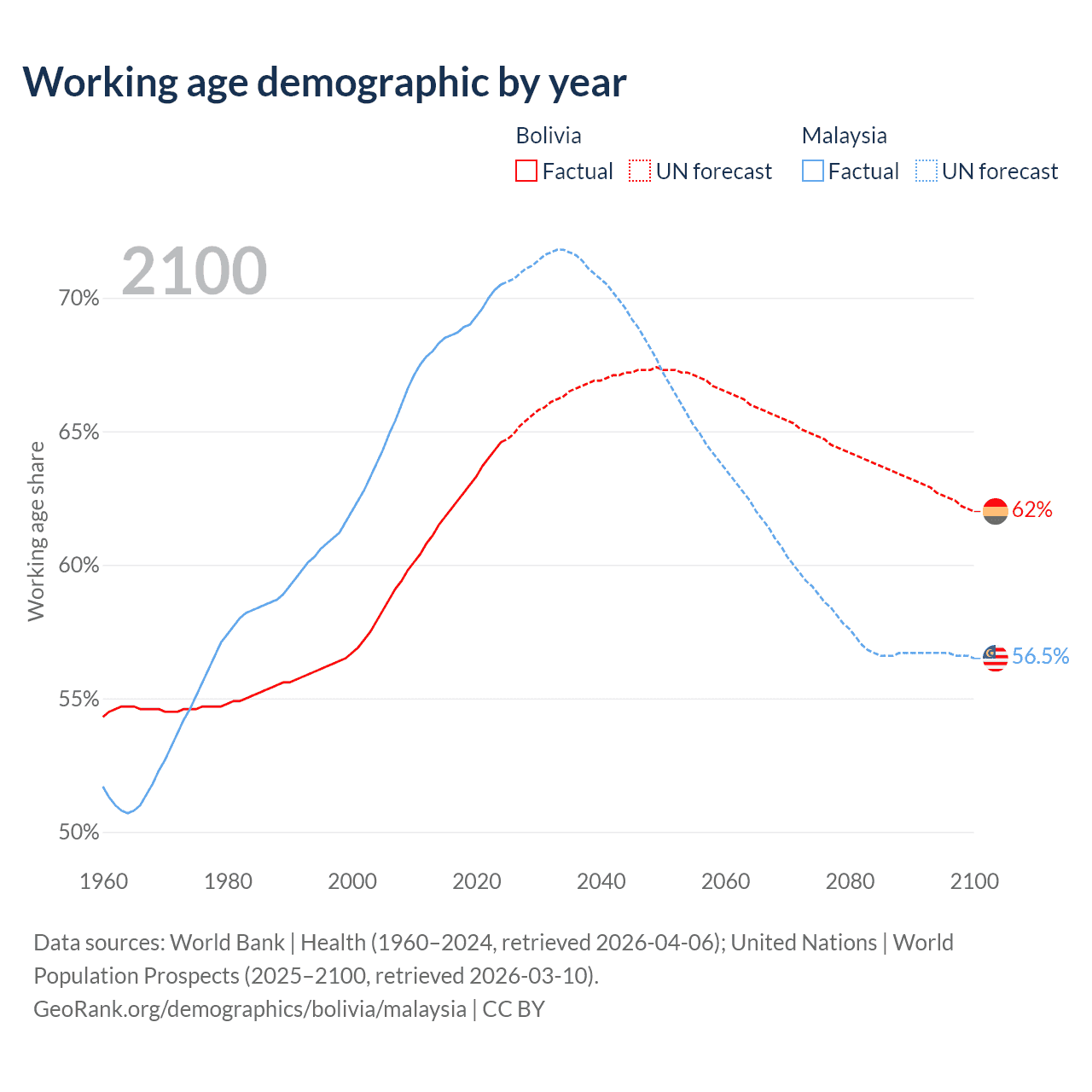 - Bolivia has 8.26M working age adults (aged 15-64) vs 25.7M in Malaysia.