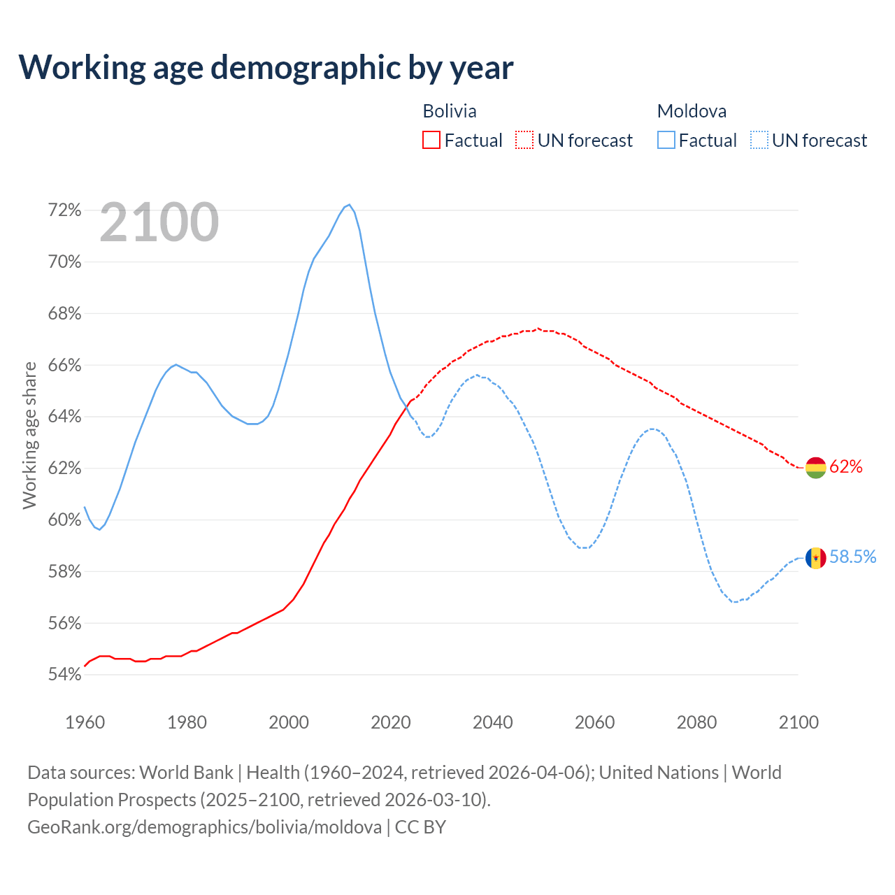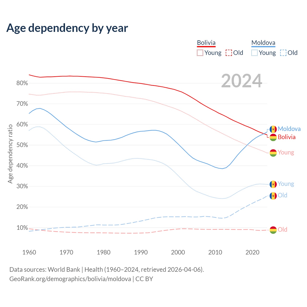 - The share of old-age demographic (65+) in Bolivia is 5.64% vs 16.2% in Moldova.