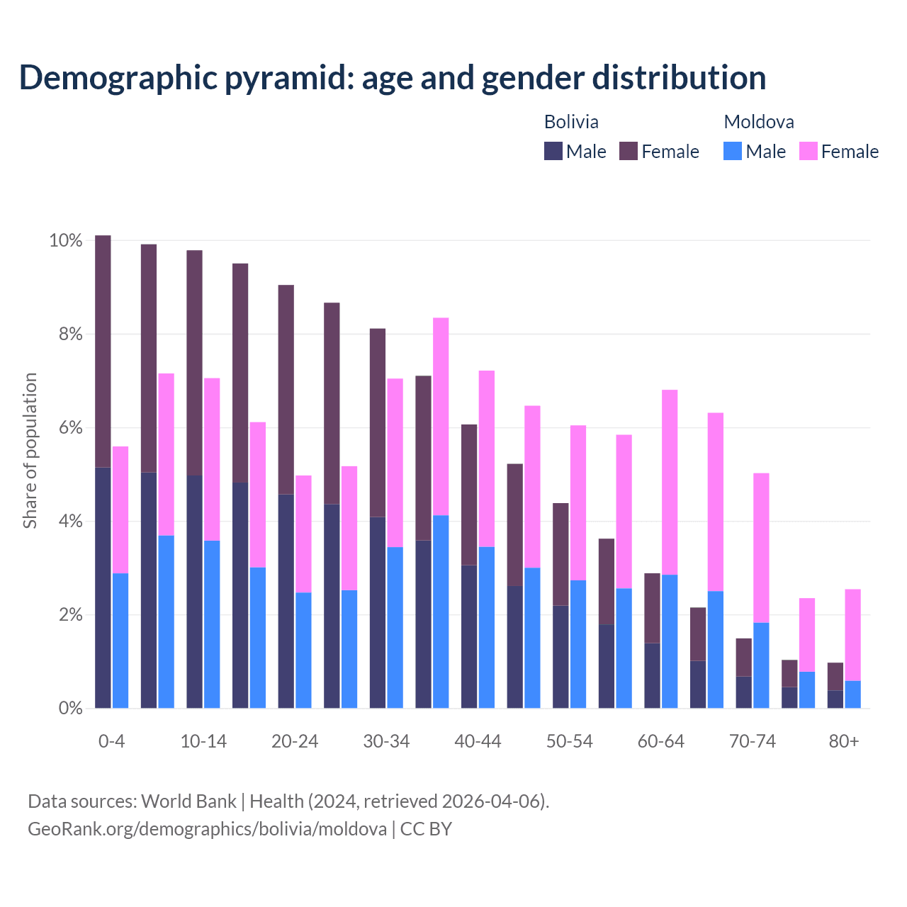 - Bolivia is ranked 128/196 by median age (oldest to youngest) vs 54/196 for Moldova.
