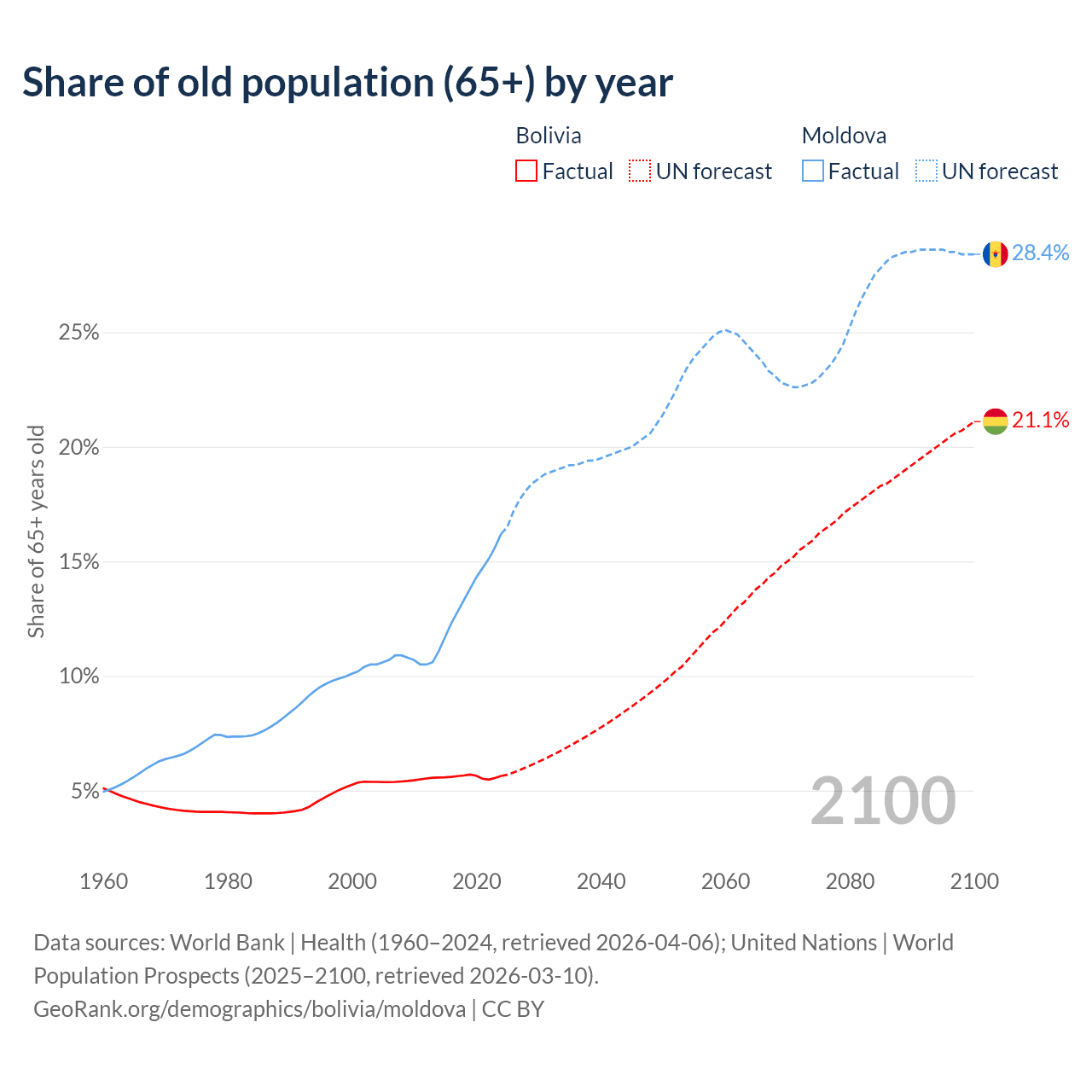 The share of older people aged 65 and over is 5.64% in Bolivia and 16.2% in Moldova. Life expectancy in Bolivia compared to Moldova .