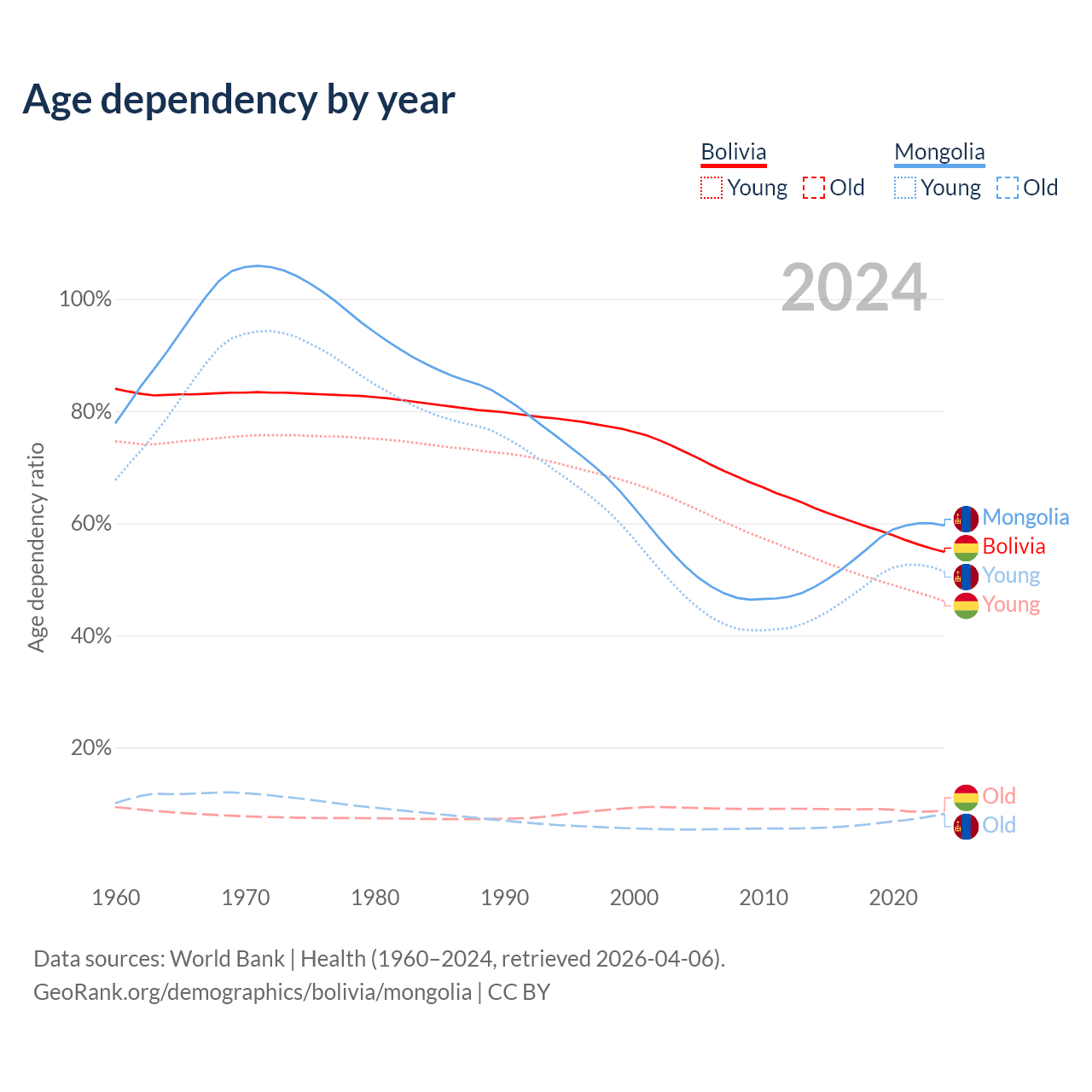 - The share of old-age demographic (65+) in Bolivia is 5.64% vs 5.14% in Mongolia.