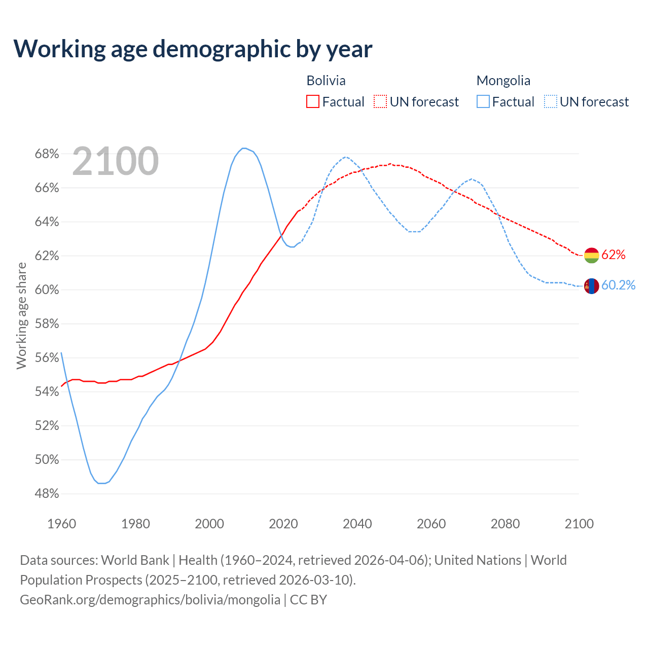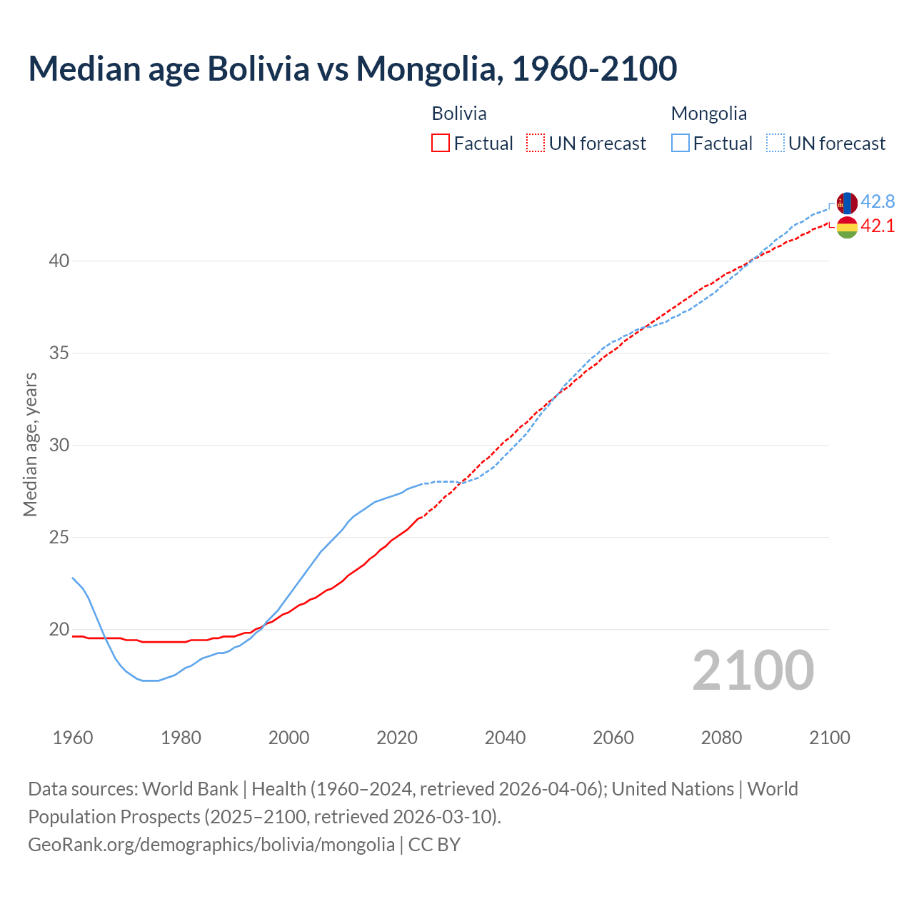 Median age Bolivia vs Mongolia, 1960-2100