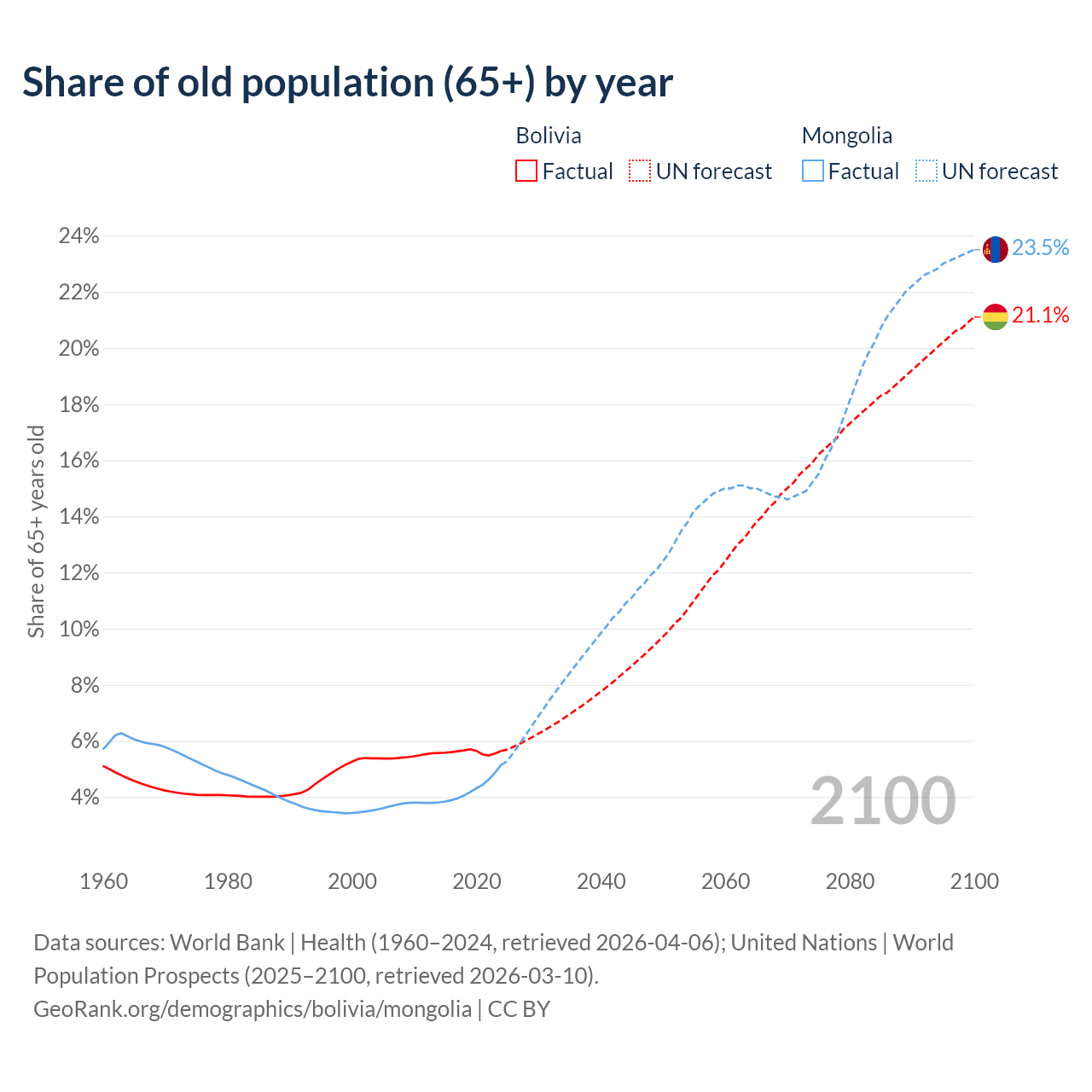 The share of older people aged 65 and over is 5.64% in Bolivia and 5.14% in Mongolia. Life expectancy in Bolivia compared to Mongolia .