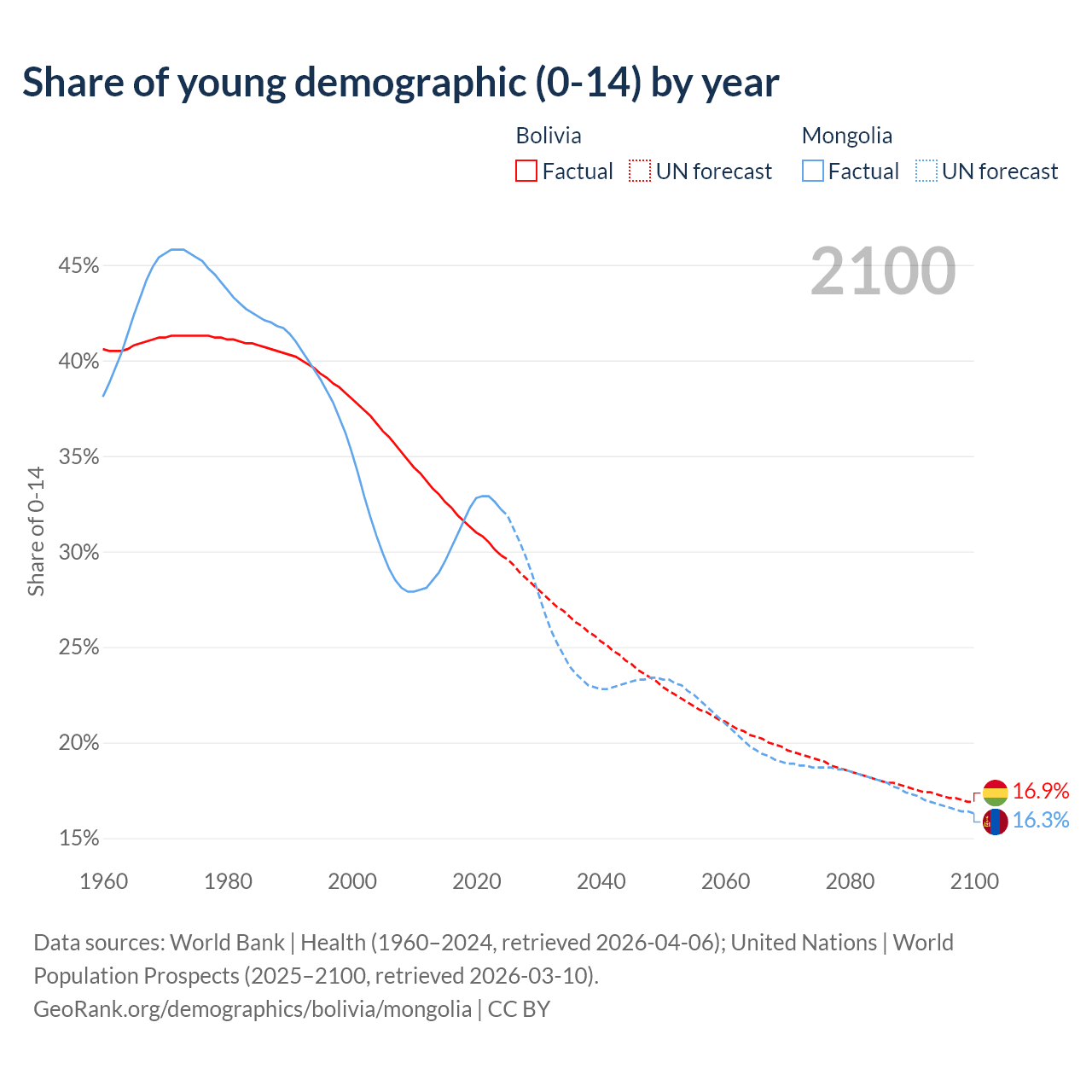 - The share of young demographic (0-15 years old) in Bolivia is 29.8% vs 32.2% in Mongolia.