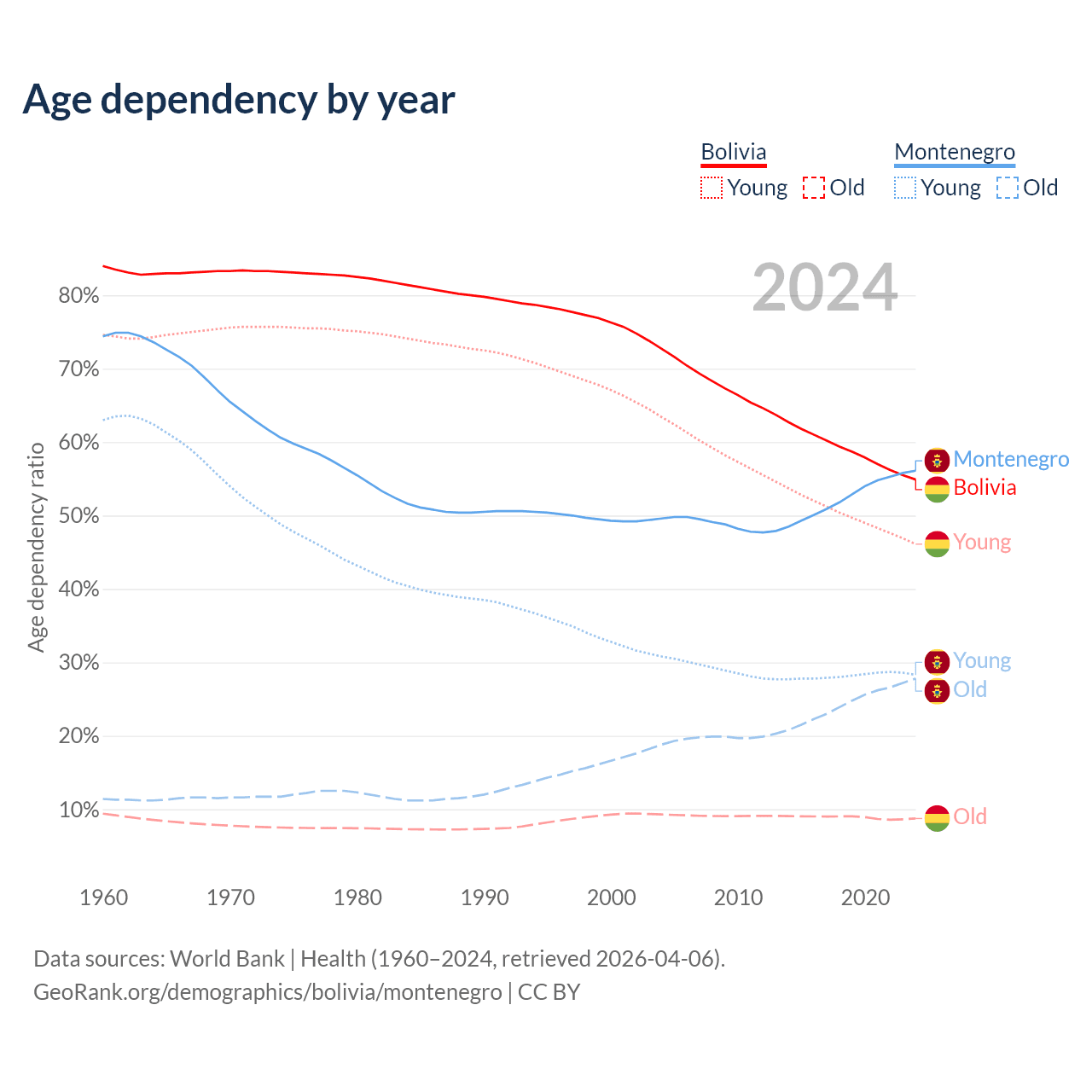 - The share of old-age demographic (65+) in Bolivia is 5.64% vs 17.8% in Montenegro.