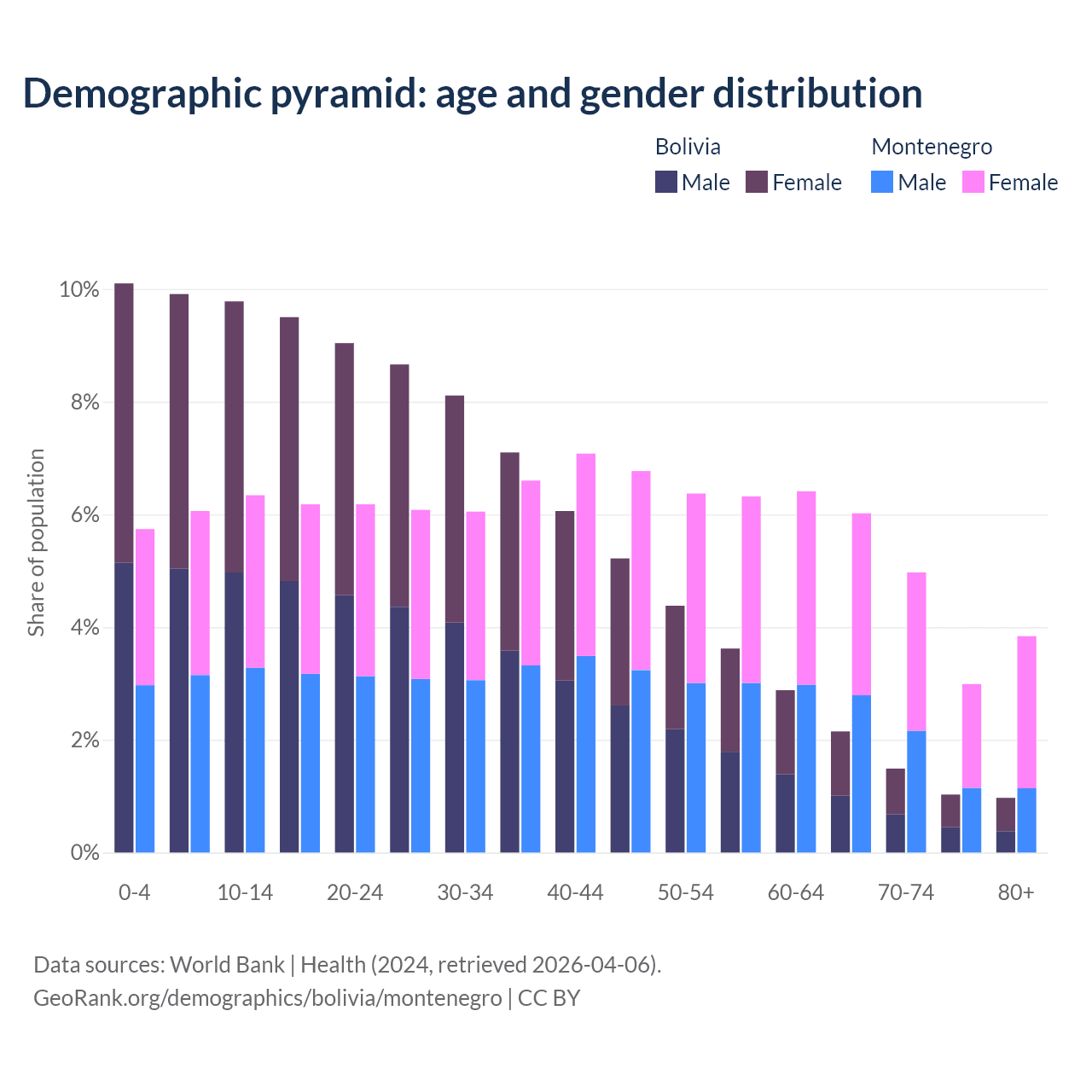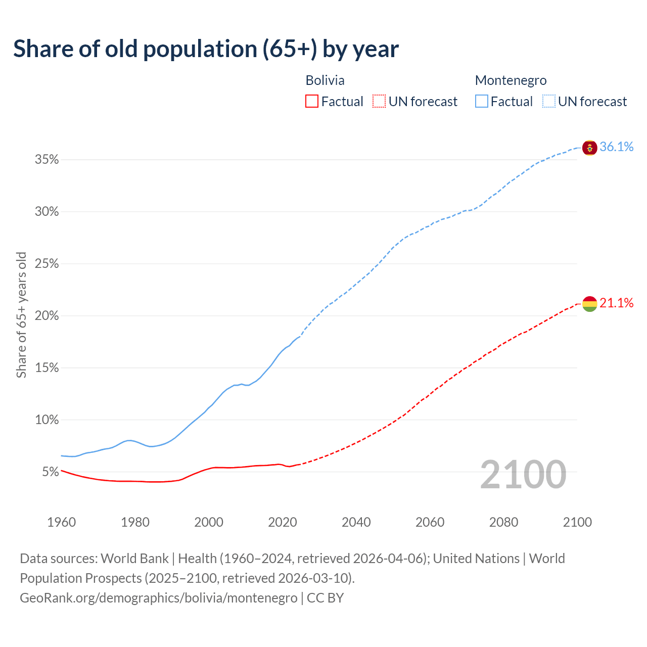 The share of older people aged 65 and over is 5.64% in Bolivia and 17.8% in Montenegro. Life expectancy in Bolivia compared to Montenegro .