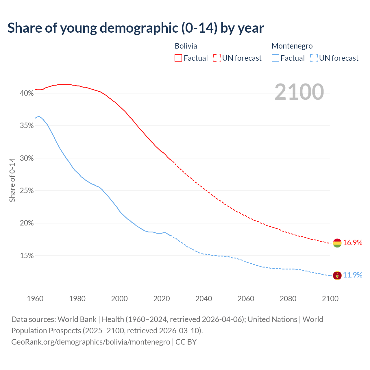 - The share of young demographic (0-15 years old) in Bolivia is 29.8% vs 18.1% in Montenegro.
