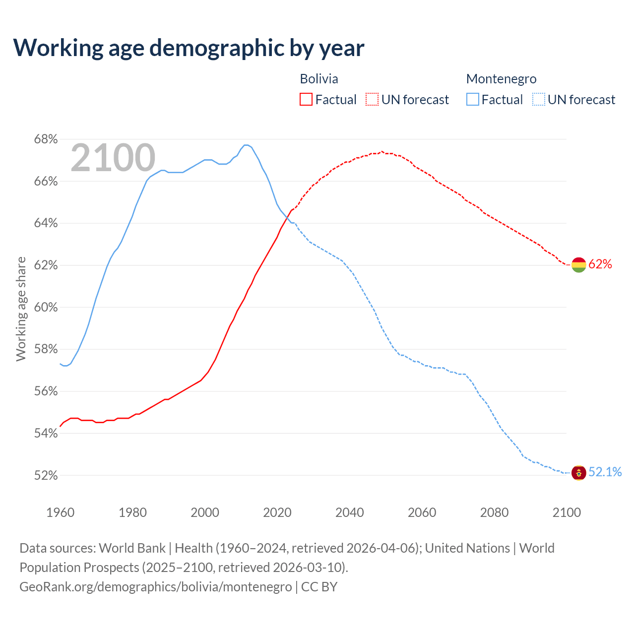 Median age Bolivia vs Montenegro, 1960-2100