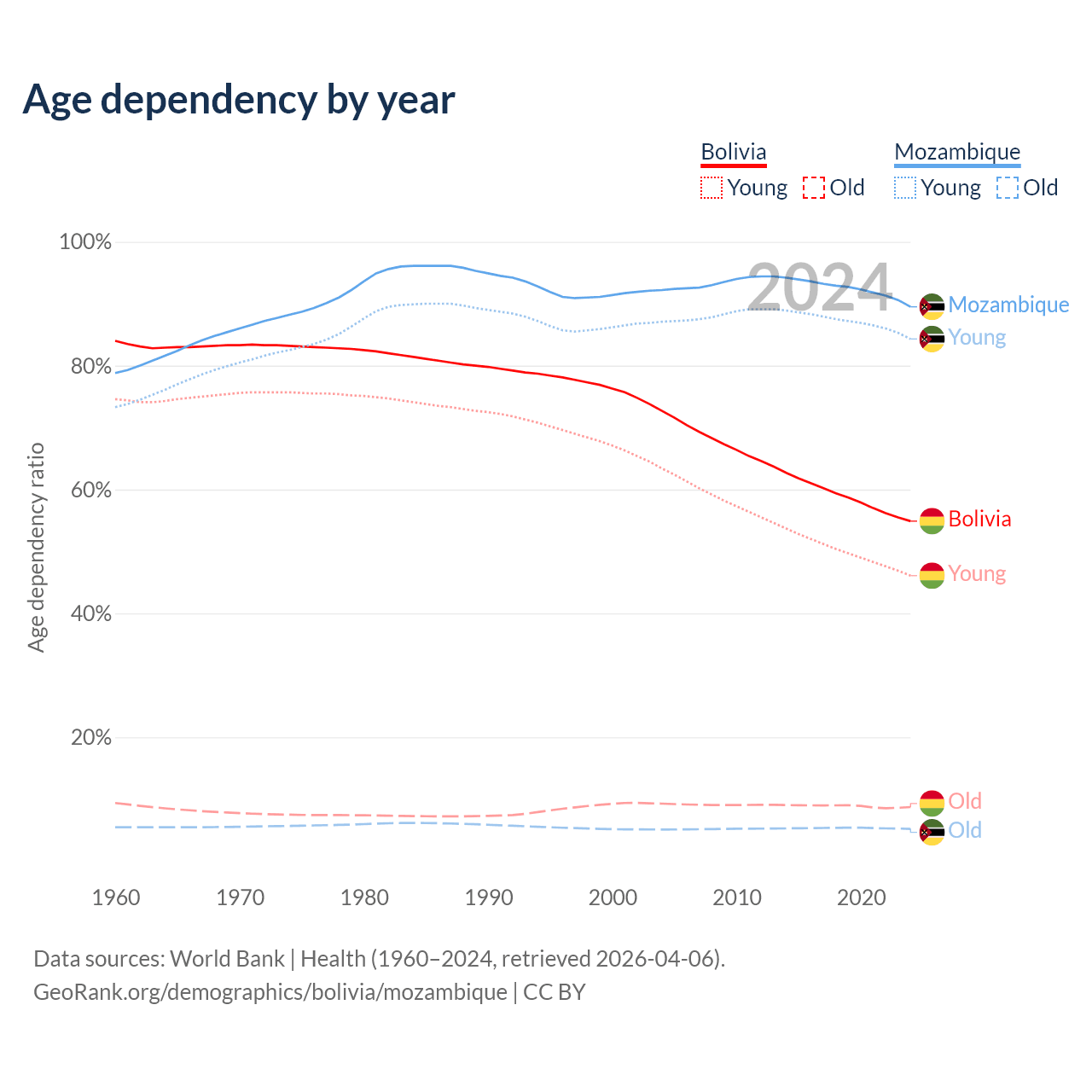 Data sources: World Bank | Health (1960–2024, retrieved 2026-04-06); U.S. Census Bureau (1960–2024, retrieved 2026-02-08).