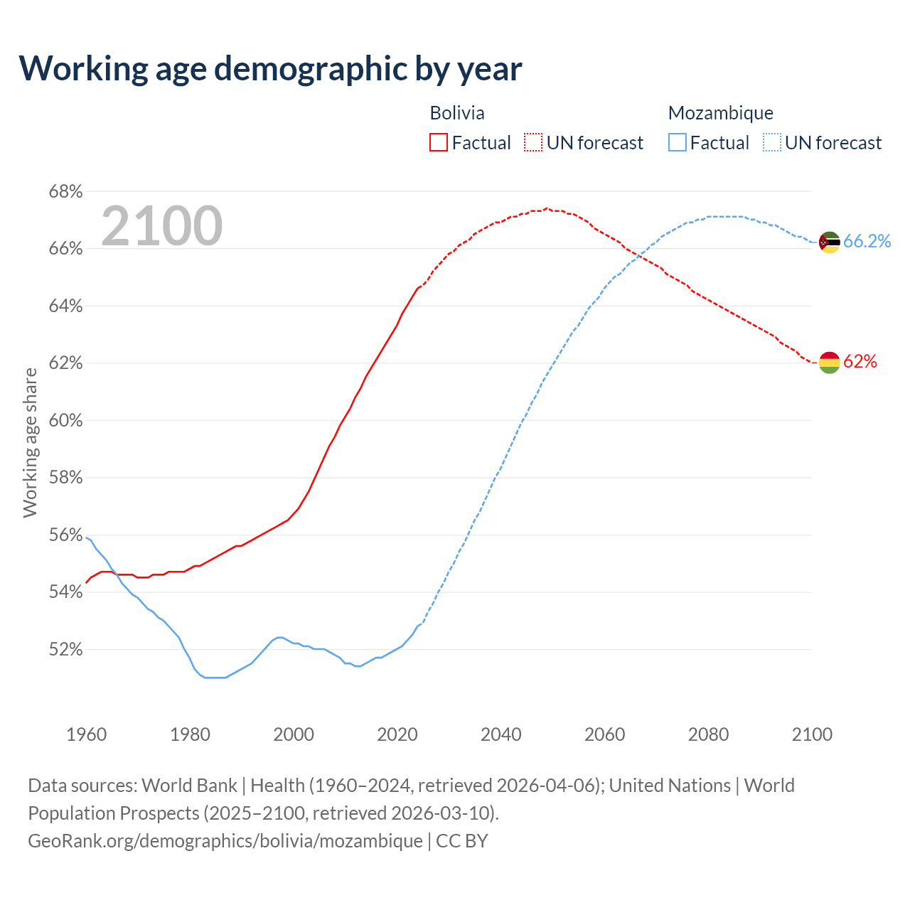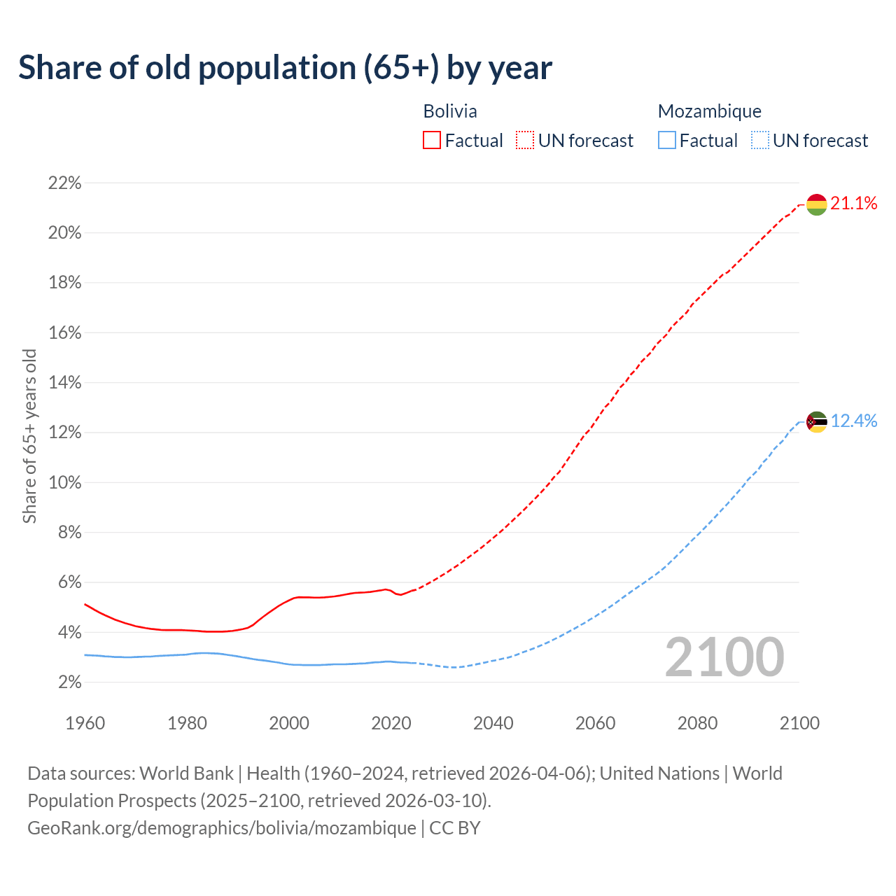 The share of older people aged 65 and over is 5.64% in Bolivia and 2.75% in Mozambique. Life expectancy in Bolivia compared to Mozambique .