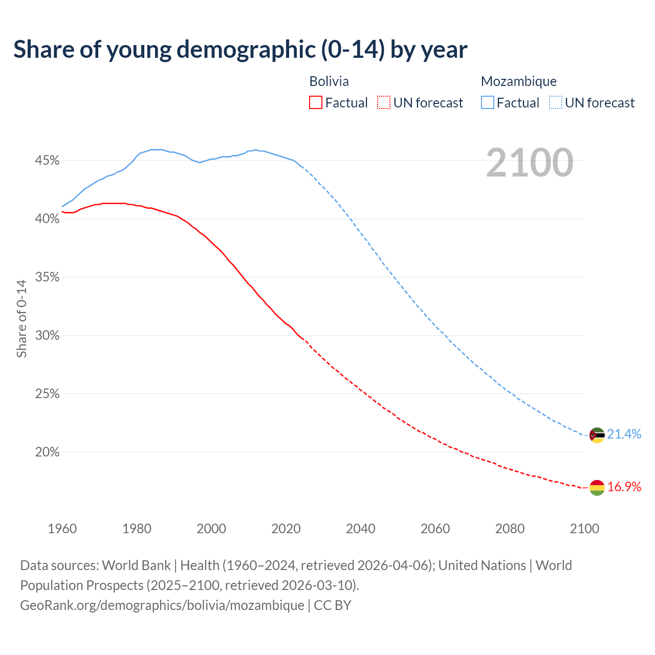 - The share of young demographic (0-15 years old) in Bolivia is 29.8% vs 44.5% in Mozambique.