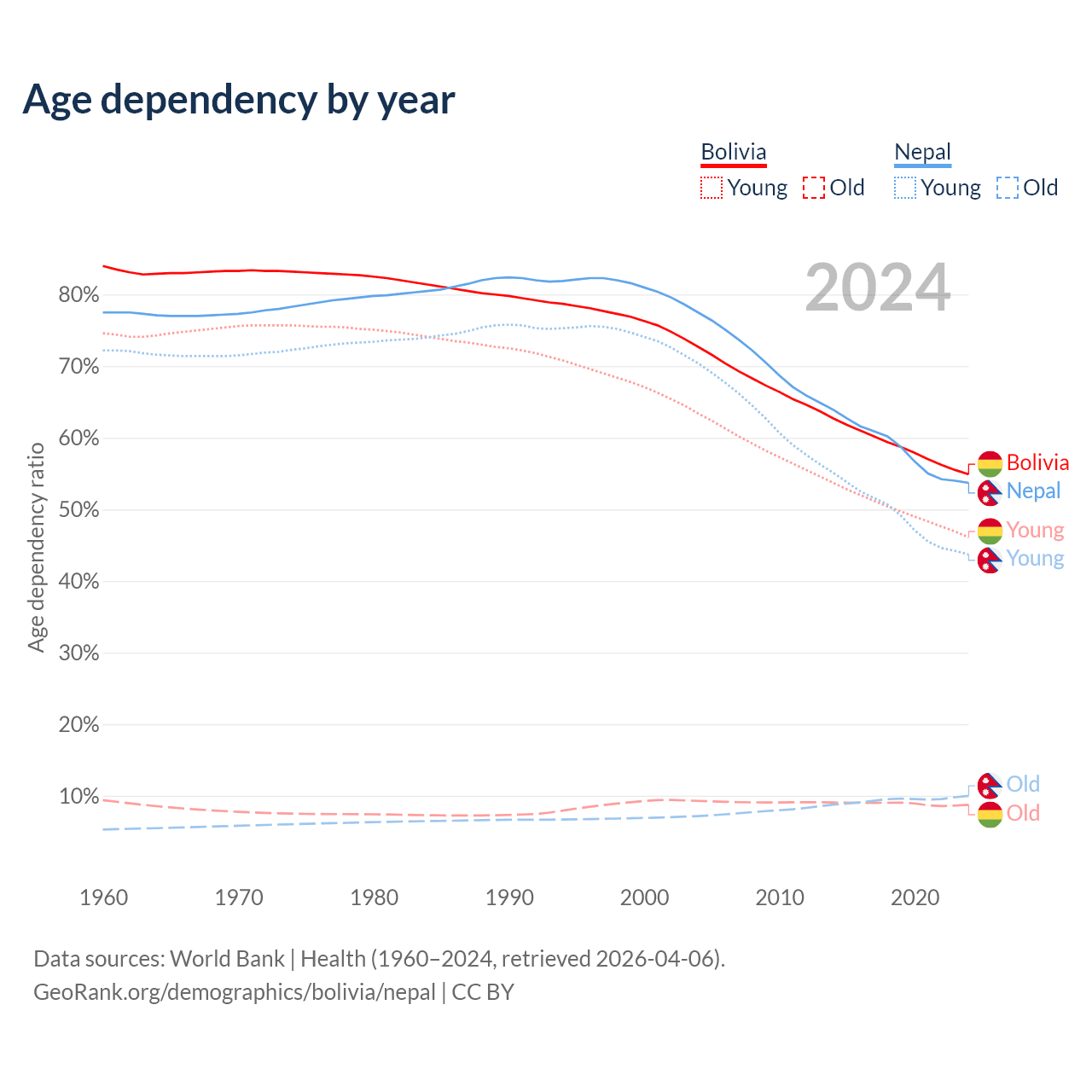 - The share of old-age demographic (65+) in Bolivia is 5.64% vs 6.5% in Nepal.
