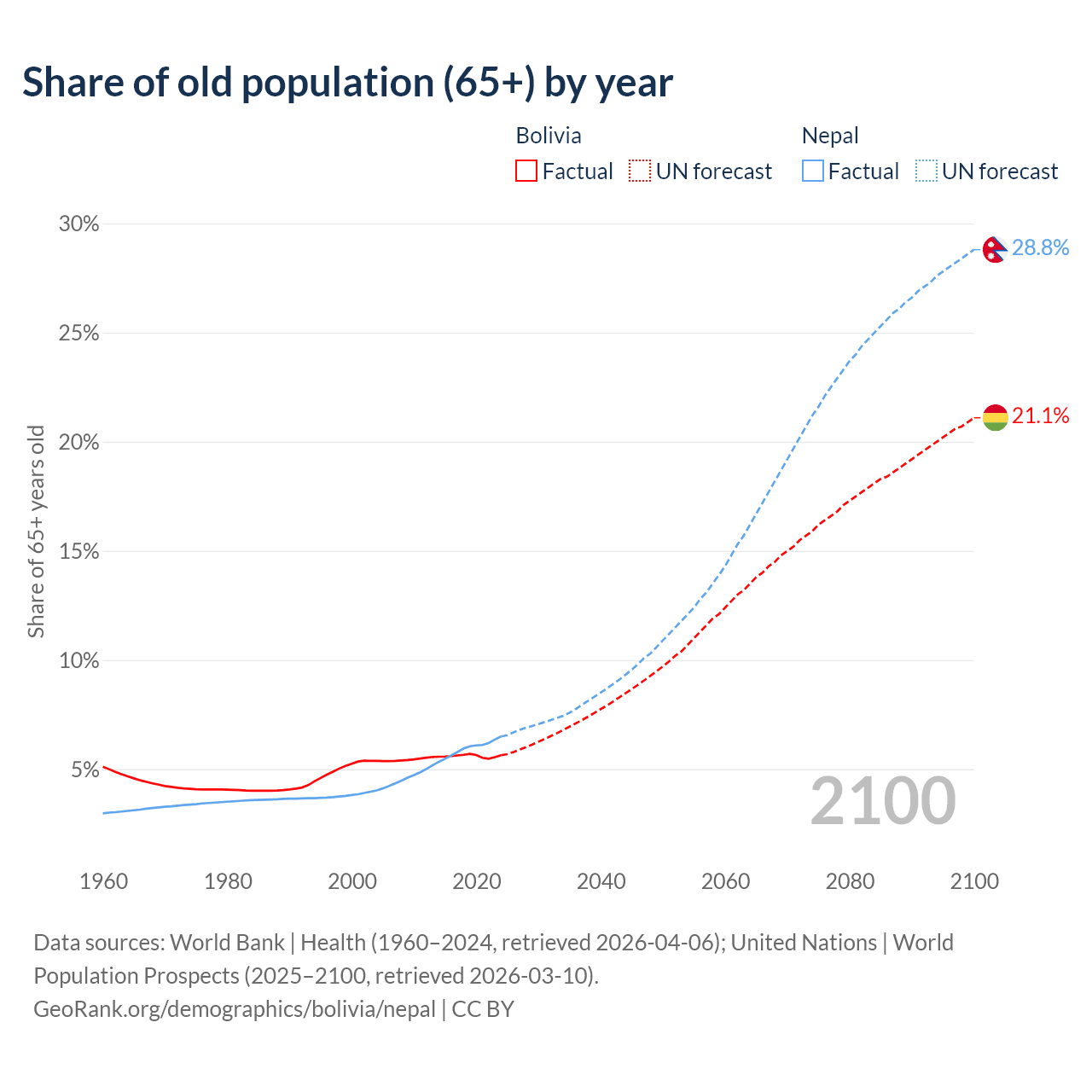The share of older people aged 65 and over is 5.64% in Bolivia and 6.5% in Nepal. Life expectancy in Bolivia compared to Nepal .