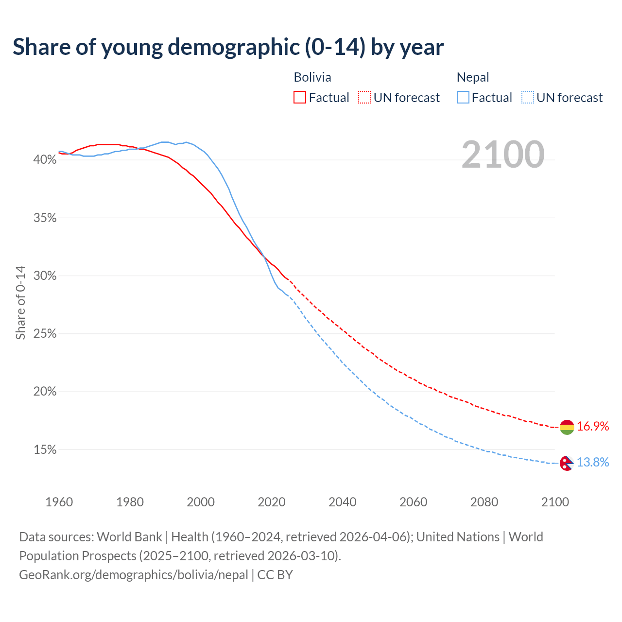- The share of young demographic (0-15 years old) in Bolivia is 29.8% vs 28.4% in Nepal.
