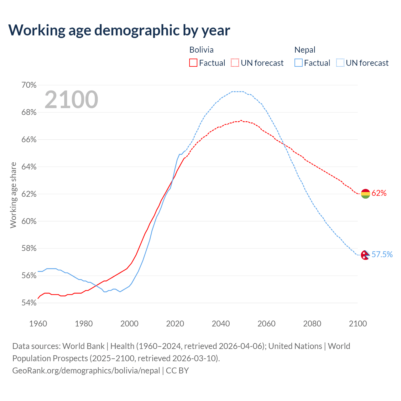 Median age Bolivia vs Nepal, 1960-2100