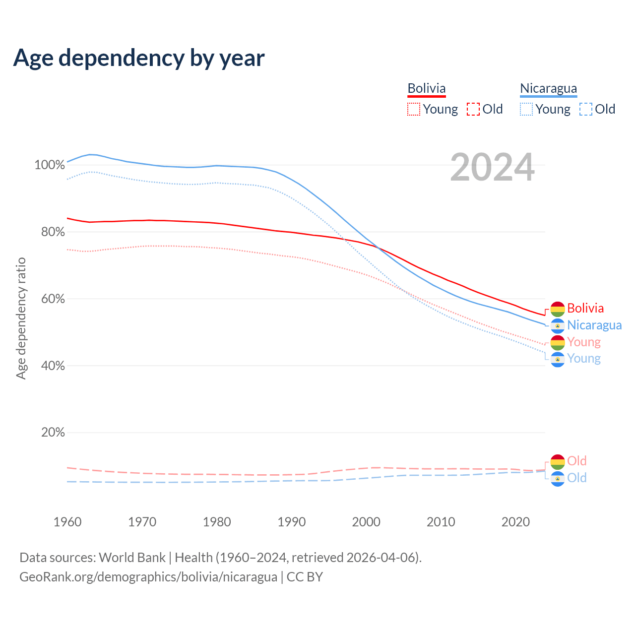 Data sources: World Bank | Health (1960–2024, retrieved 2026-04-06); U.S. Census Bureau (1960–2024, retrieved 2026-02-08).