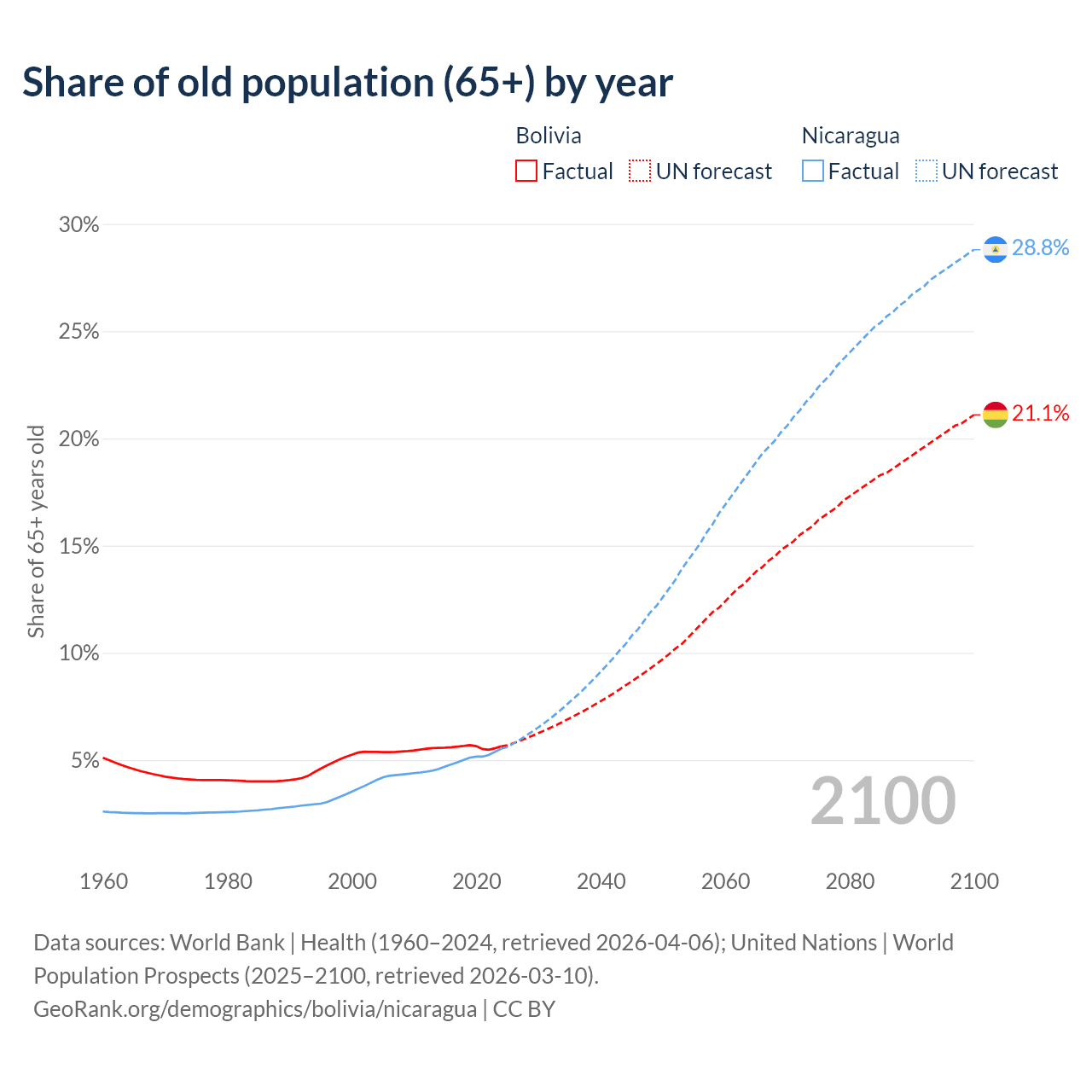 The share of older people aged 65 and over is 5.64% in Bolivia and 5.53% in Nicaragua. Life expectancy in Bolivia compared to Nicaragua .