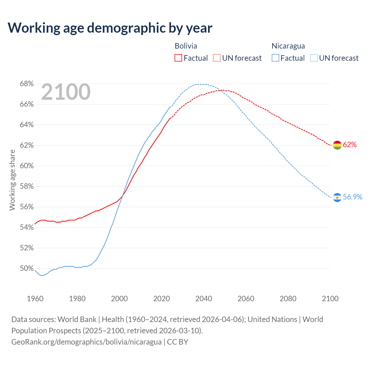 Median age Bolivia vs Nicaragua, 1960-2100