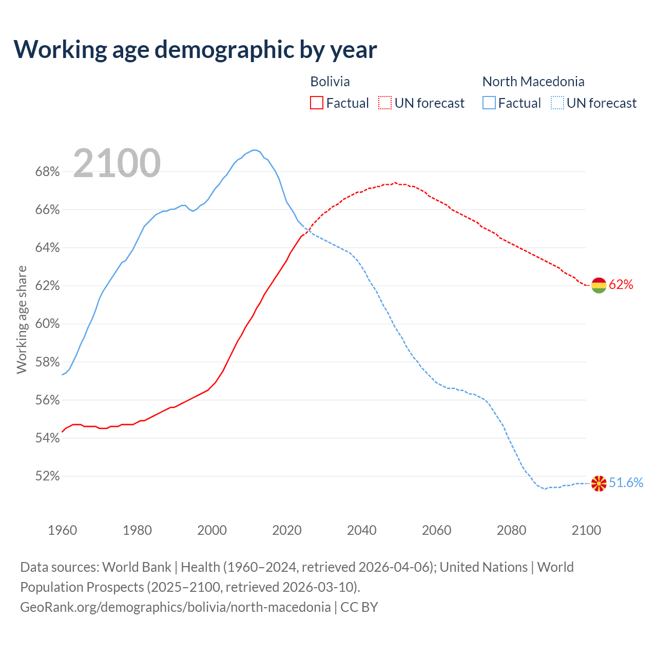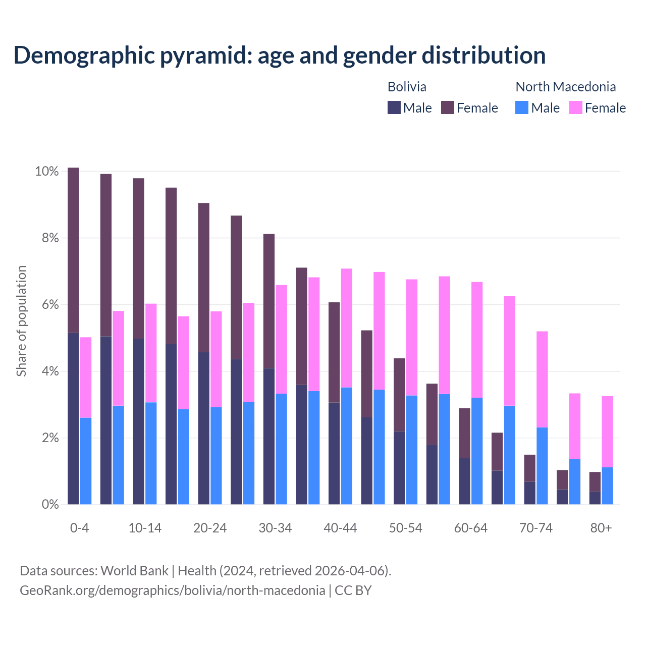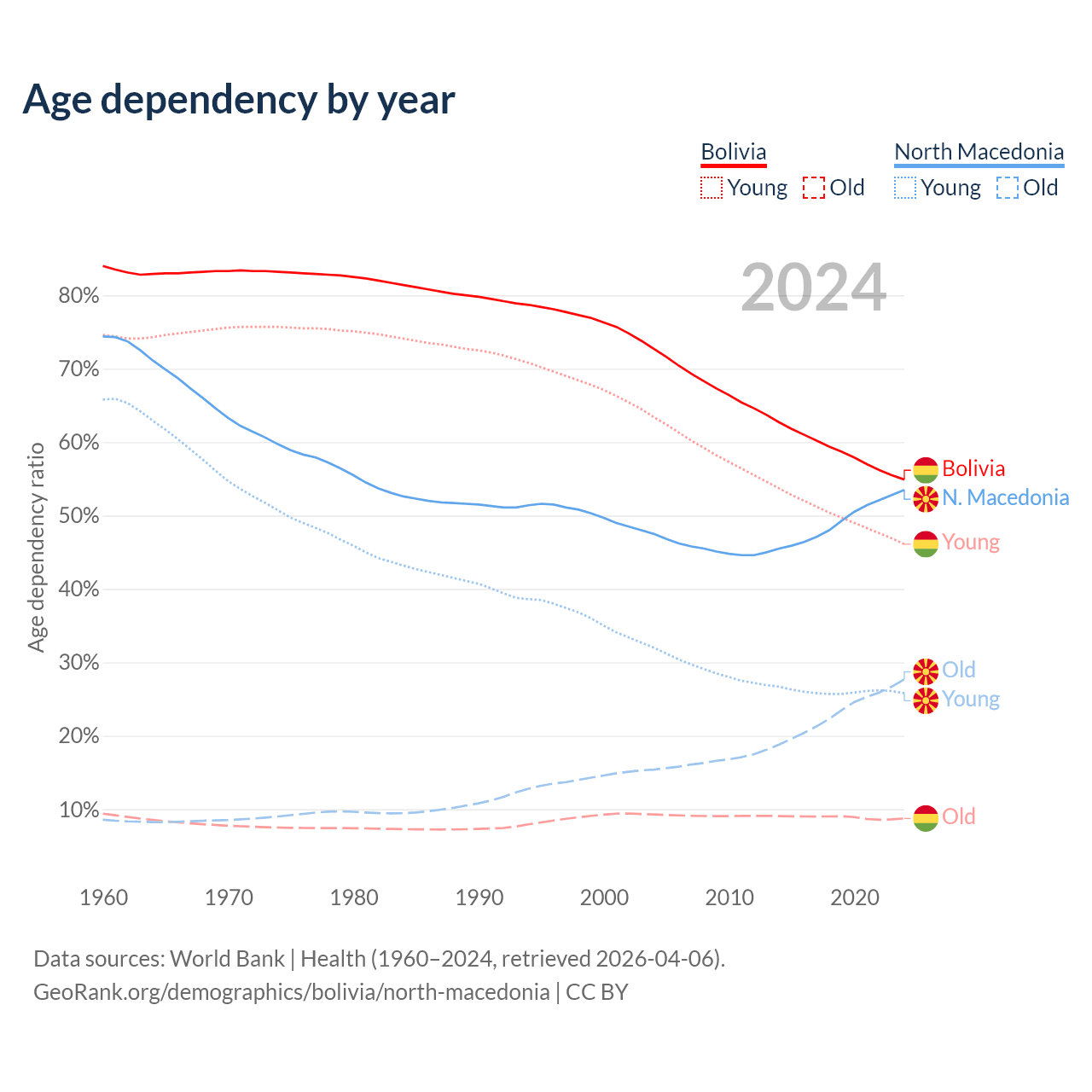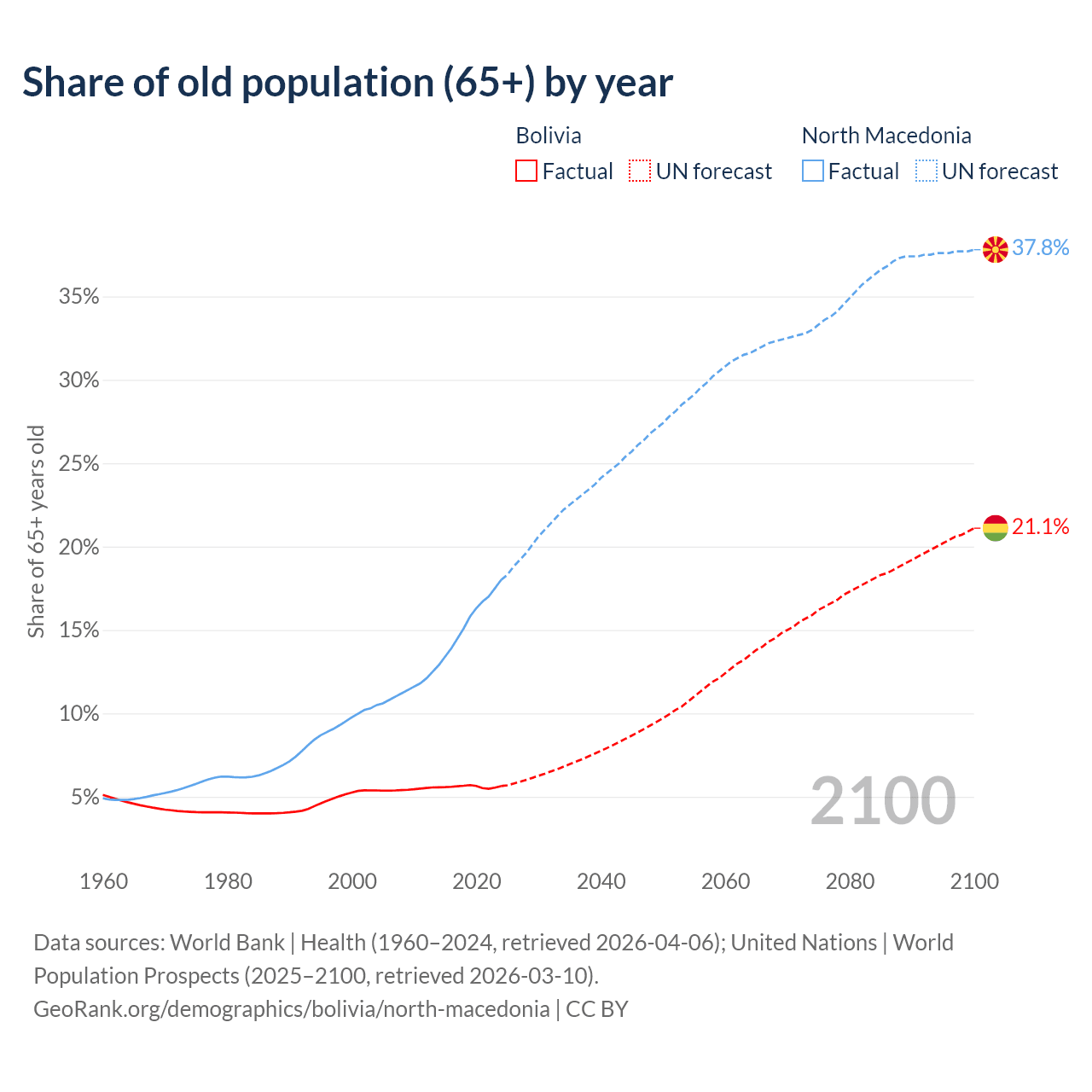 The share of older people aged 65 and over is 5.64% in Bolivia and 18% in North Macedonia. Life expectancy in Bolivia compared to North Macedonia .