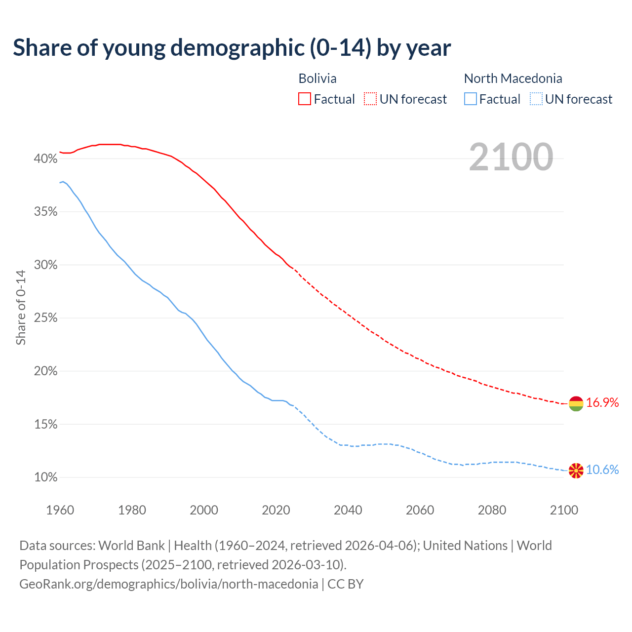 - The share of young demographic (0-15 years old) in Bolivia is 29.8% vs 16.8% in North Macedonia.