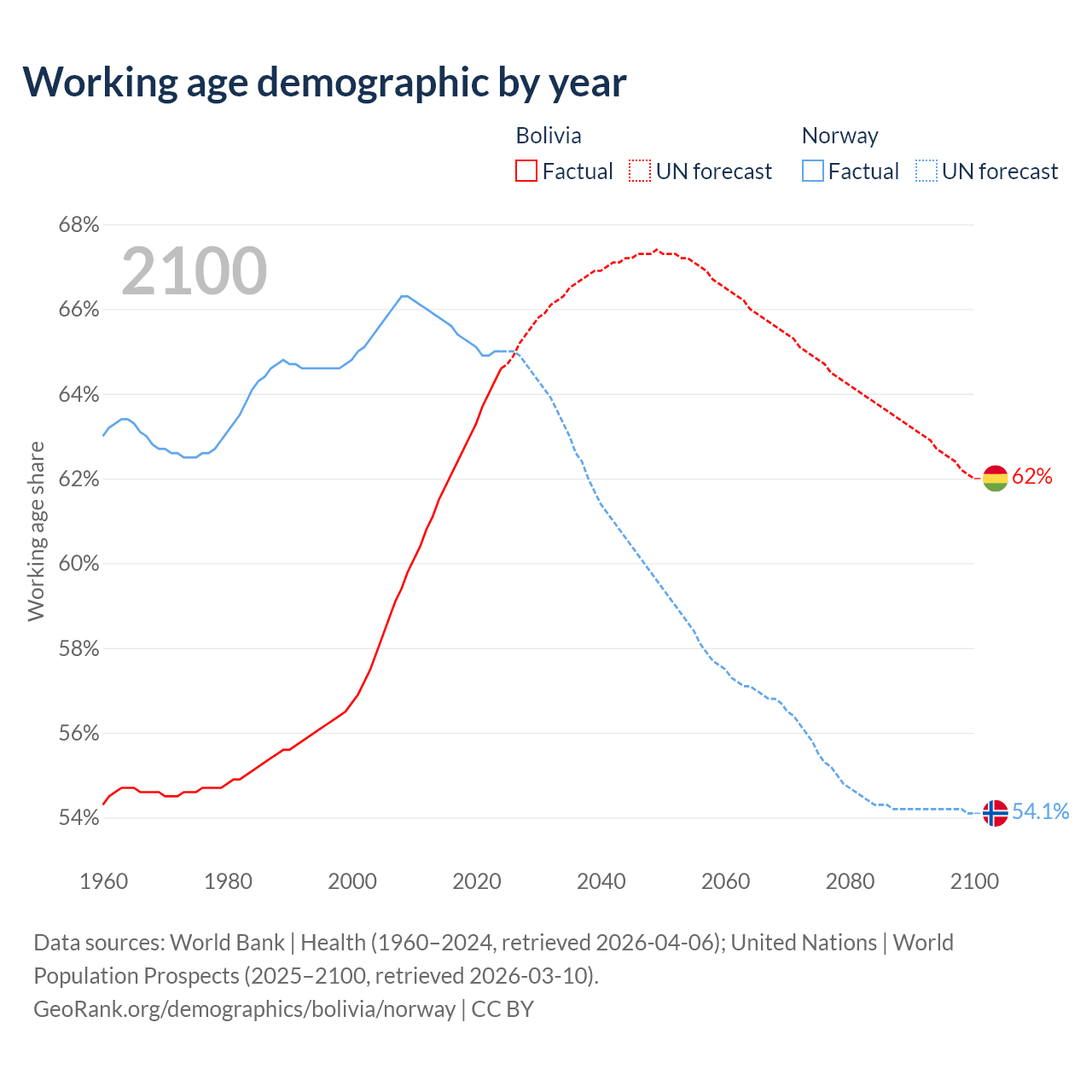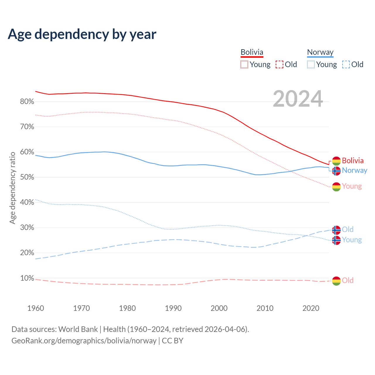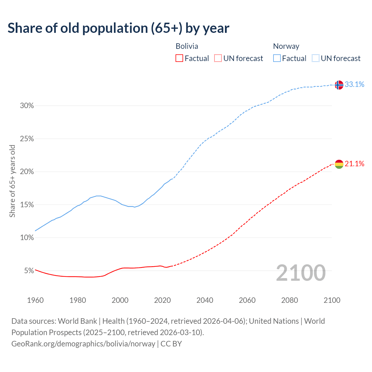 - The share of old-age demographic (65+) in Bolivia is 5.64% vs 18.8% in Norway.