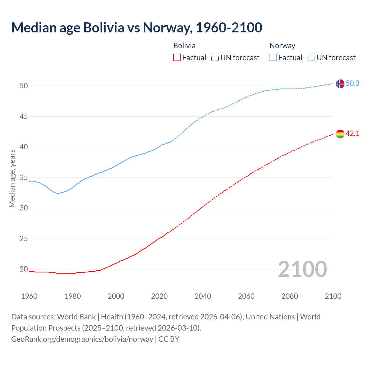 Median age Bolivia vs Norway, 1960-2100