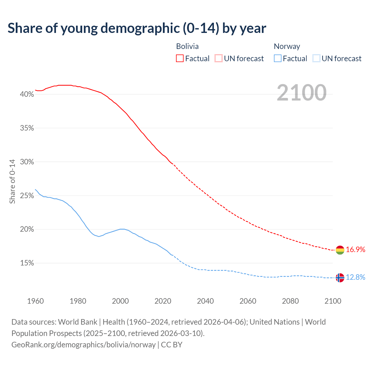 - The share of young demographic (0-15 years old) in Bolivia is 29.8% vs 16.2% in Norway.