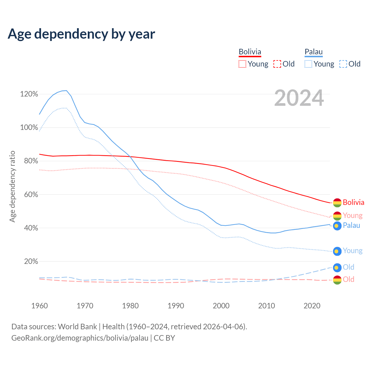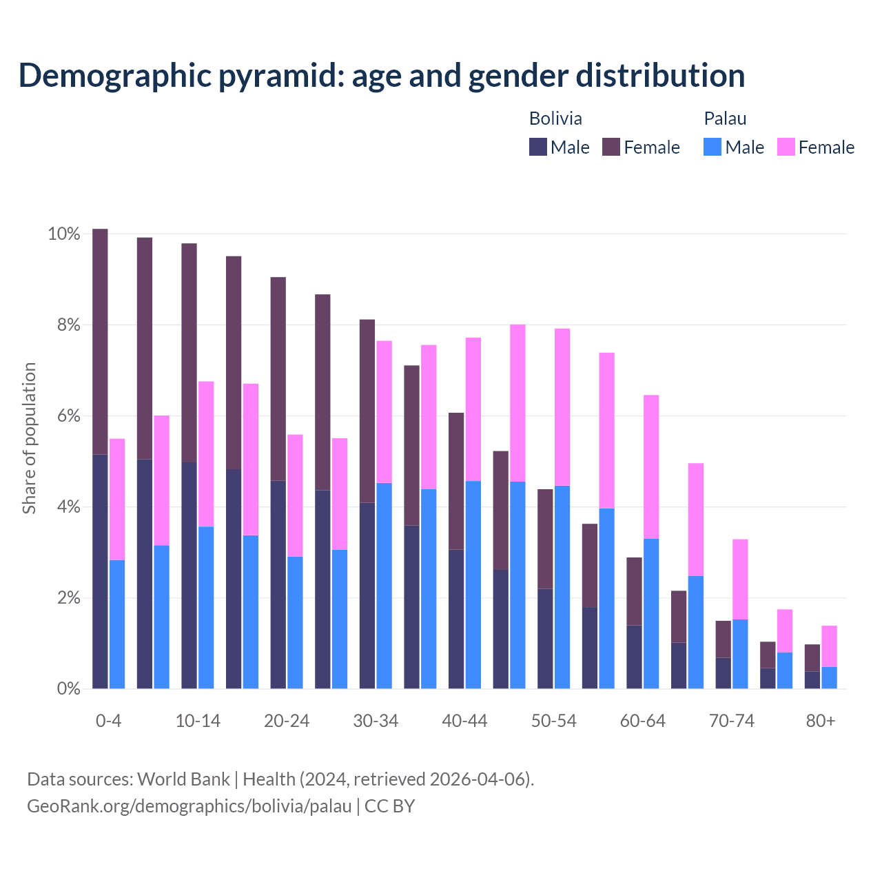 - The share of old-age demographic (65+) in Bolivia is 5.64% vs 11.3% in Palau.
