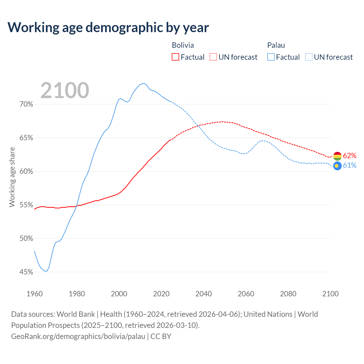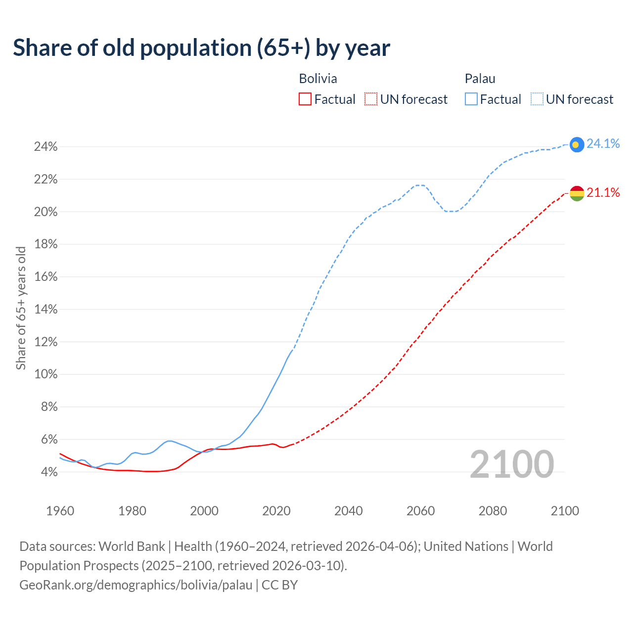 The share of older people aged 65 and over is 5.64% in Bolivia and 11.3% in Palau. Life expectancy in Bolivia compared to Palau .