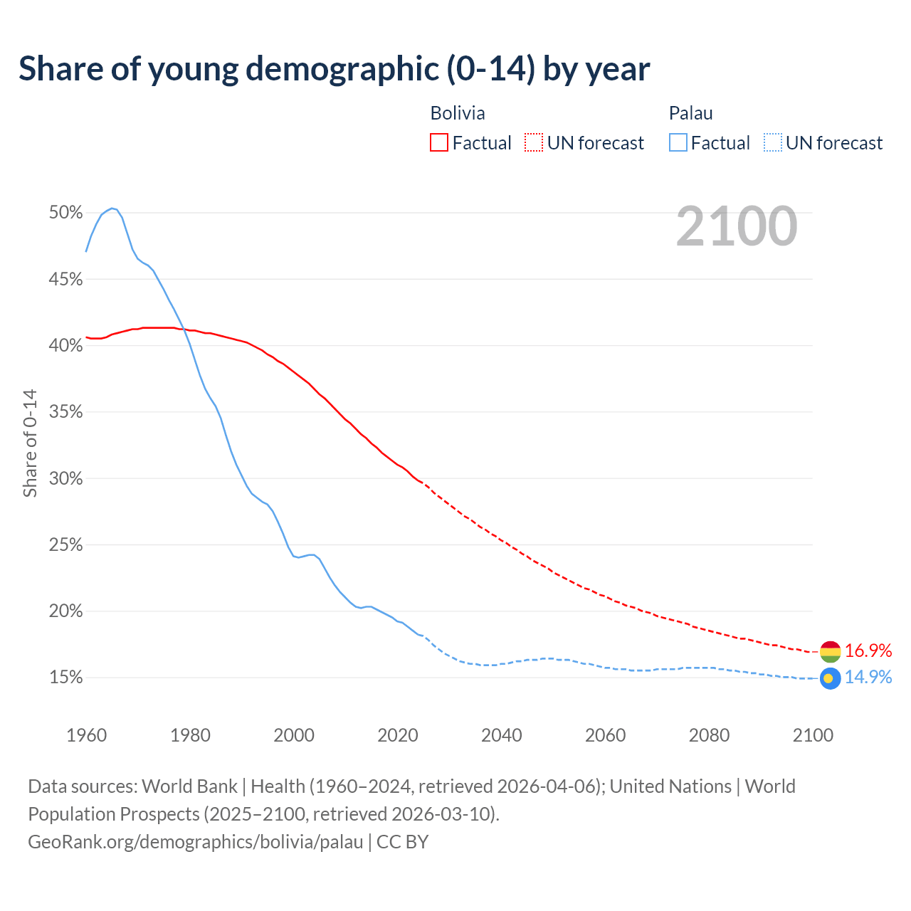 - The share of young demographic (0-15 years old) in Bolivia is 29.8% vs 18.2% in Palau.