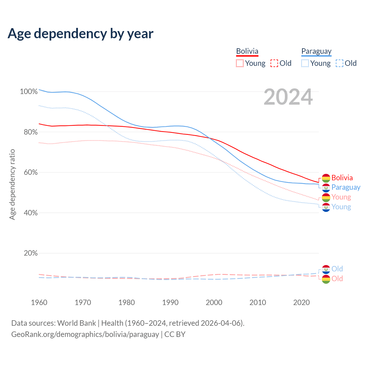 Data sources: World Bank | Health (1960–2024, retrieved 2026-04-06); U.S. Census Bureau (1960–2024, retrieved 2026-02-08).