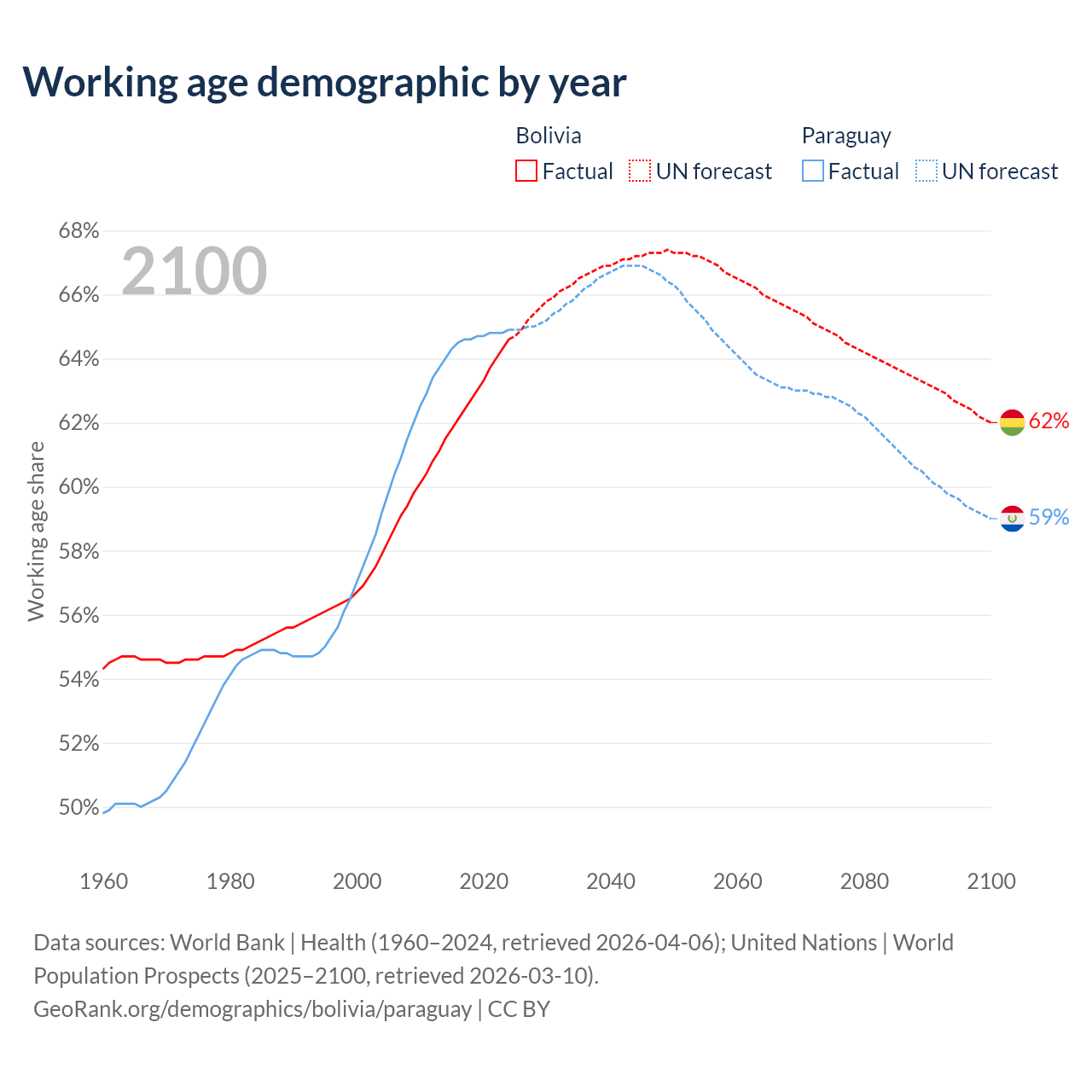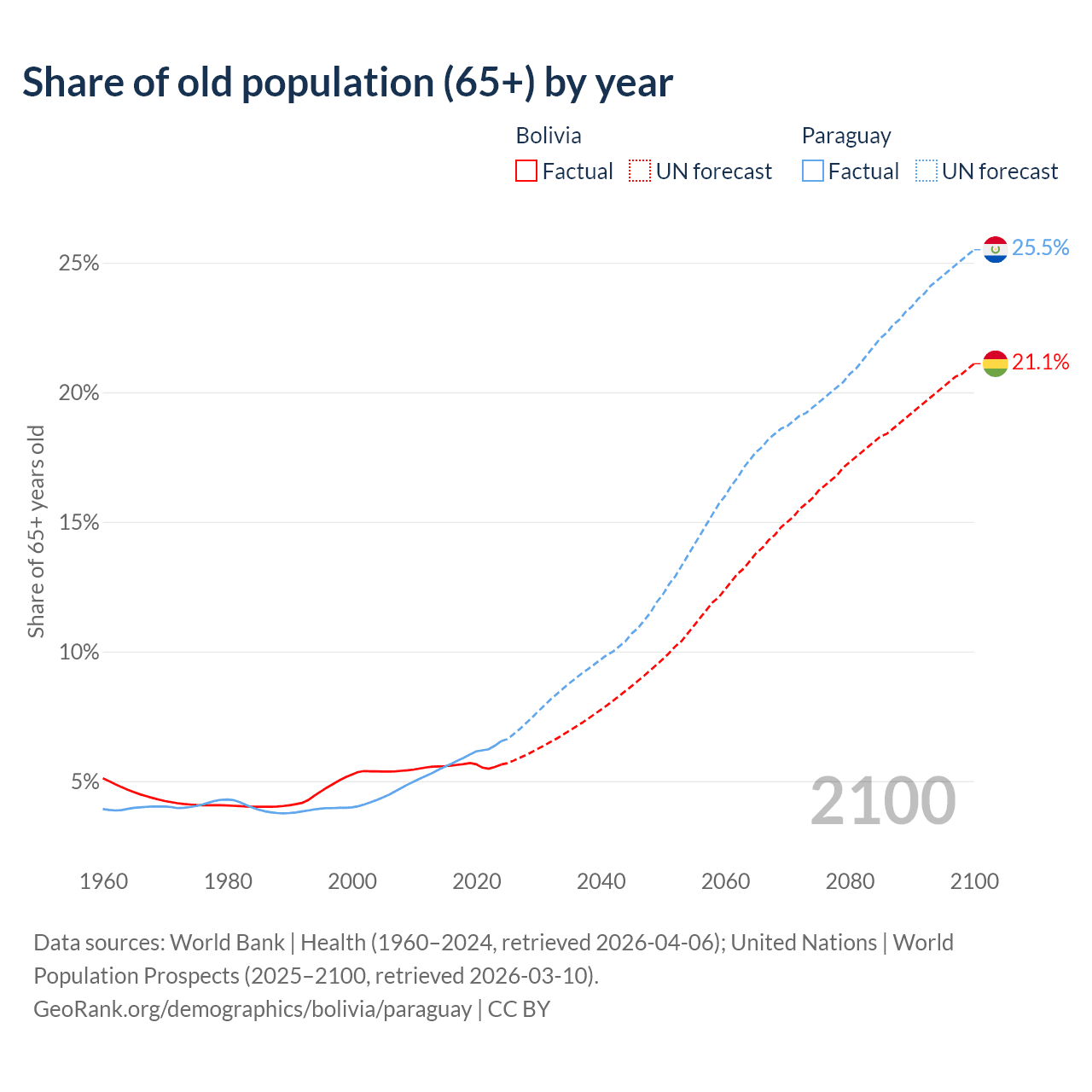 The share of older people aged 65 and over is 5.64% in Bolivia and 6.54% in Paraguay. Life expectancy in Bolivia compared to Paraguay .