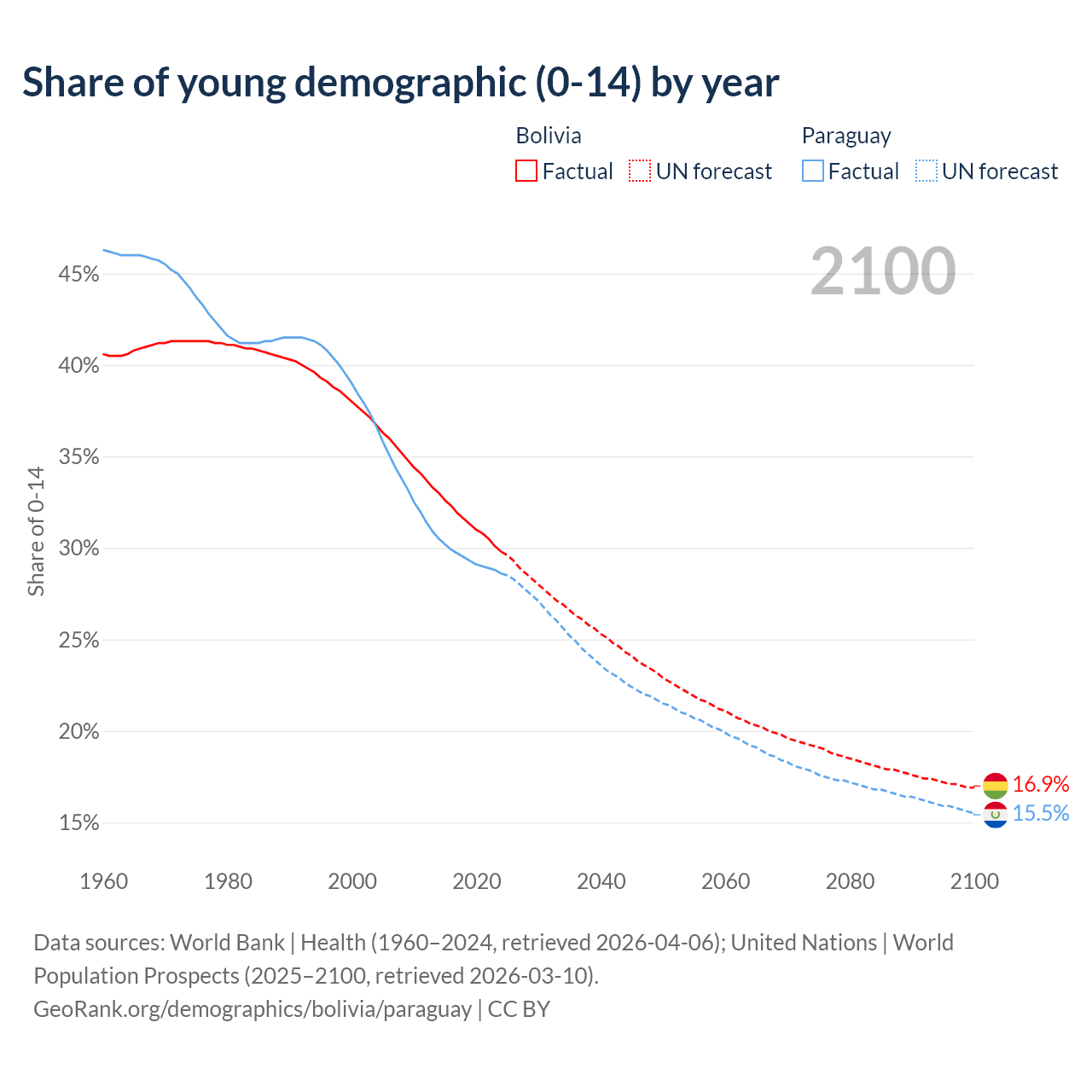 - The share of young demographic (0-15 years old) in Bolivia is 29.8% vs 28.6% in Paraguay.