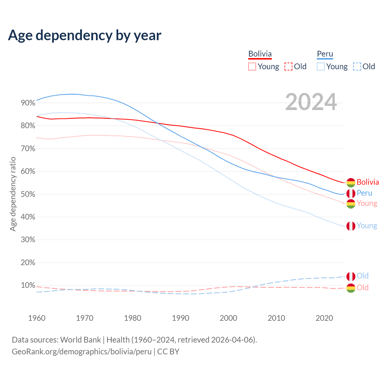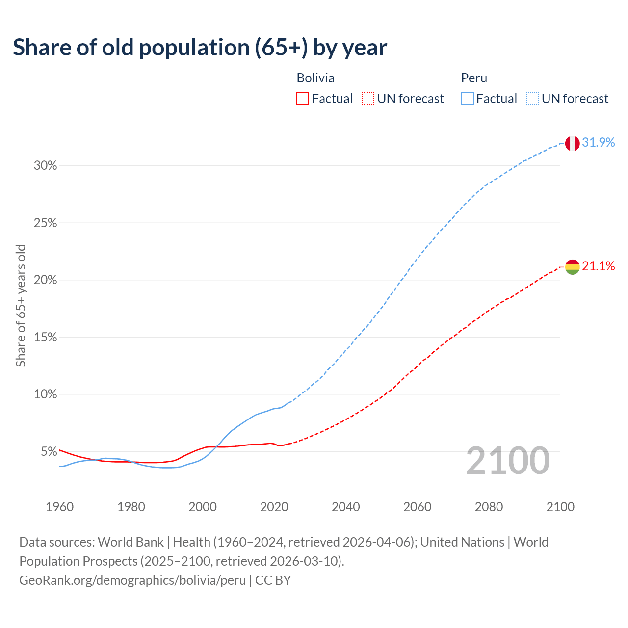 The share of older people aged 65 and over is 5.64% in Bolivia and 9.23% in Peru. Life expectancy in Bolivia compared to Peru .