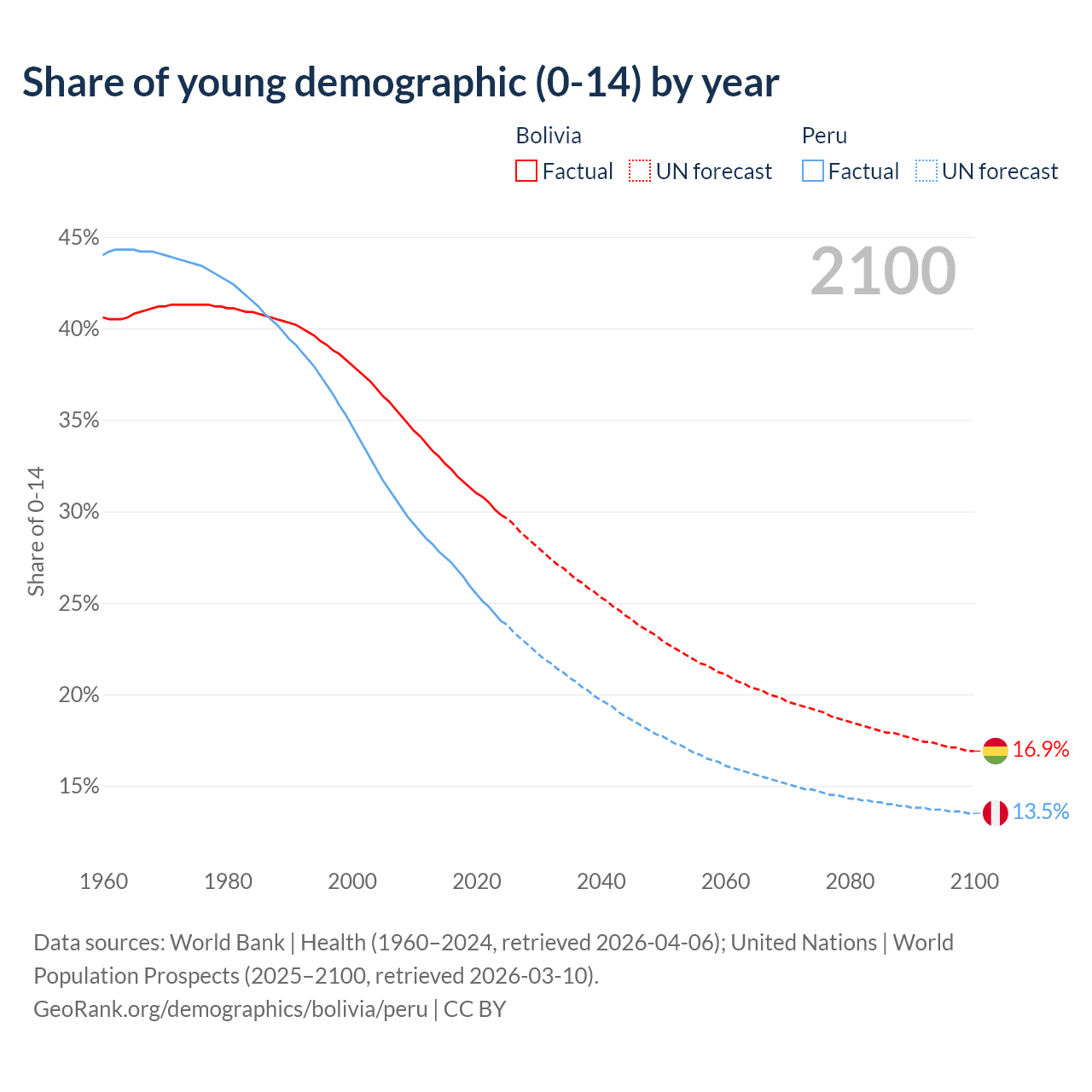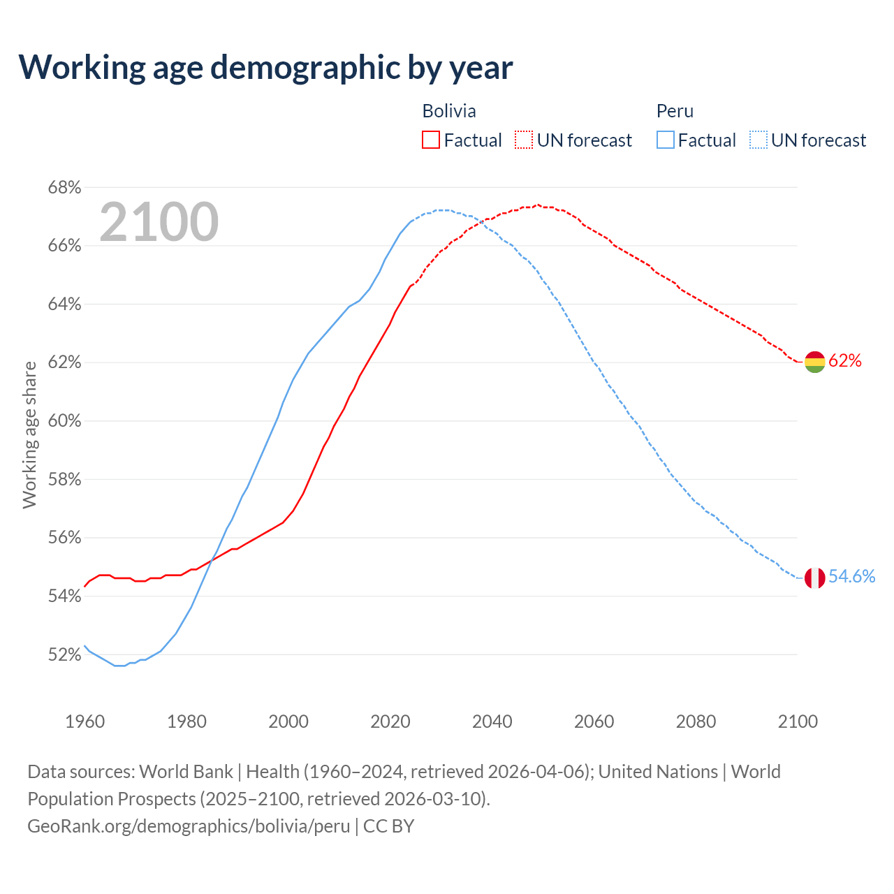Median age Bolivia vs Peru, 1960-2100