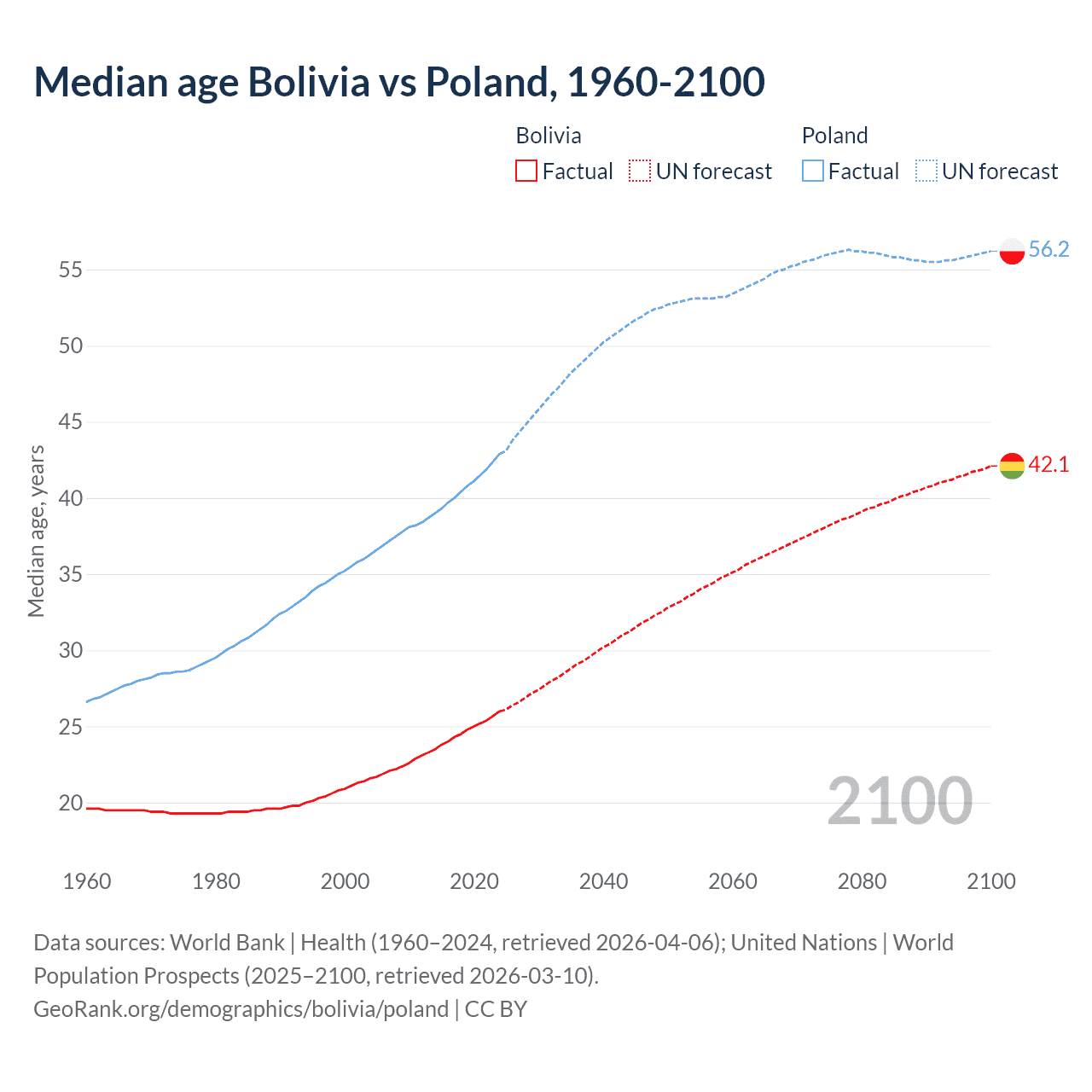 - The median age in Bolivia is 26 years compared to 42.9 years in Poland.