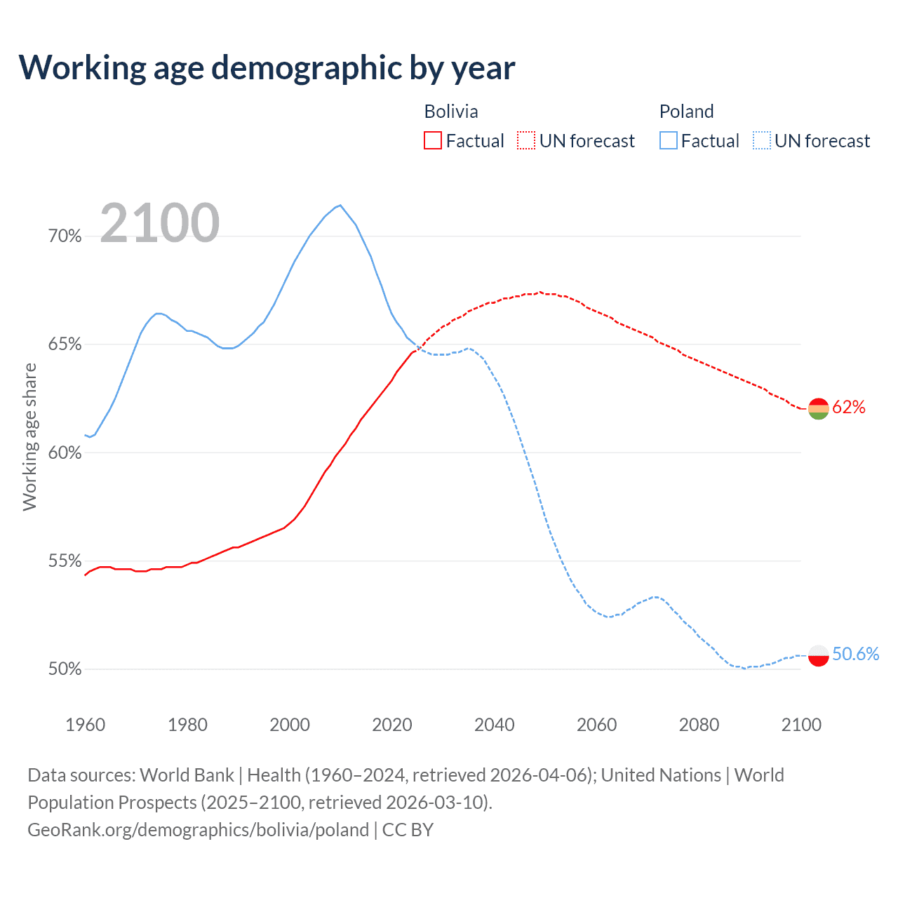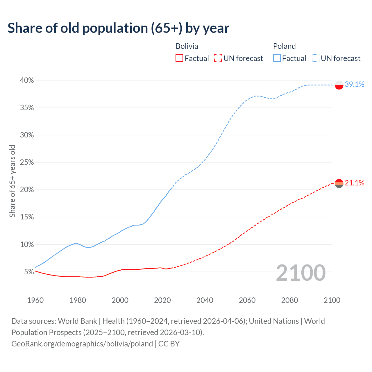 - The share of old-age demographic (65+) in Bolivia is 5.64% vs 20.1% in Poland.
