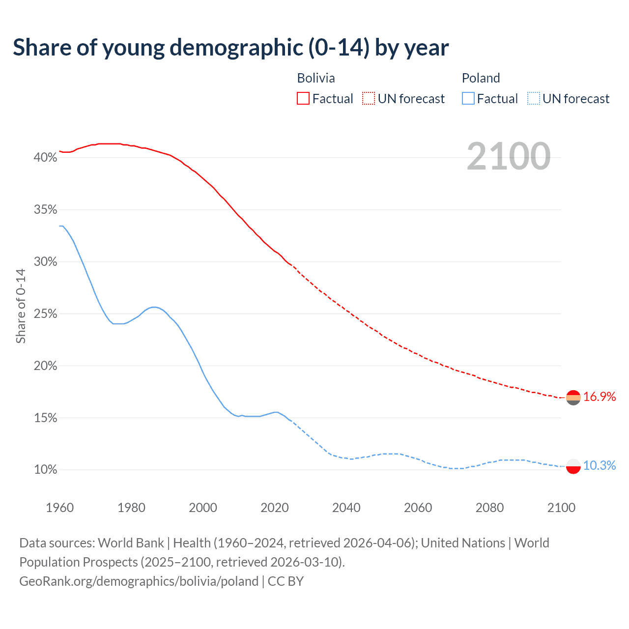 - The share of young demographic (0-15 years old) in Bolivia is 29.8% vs 14.8% in Poland.