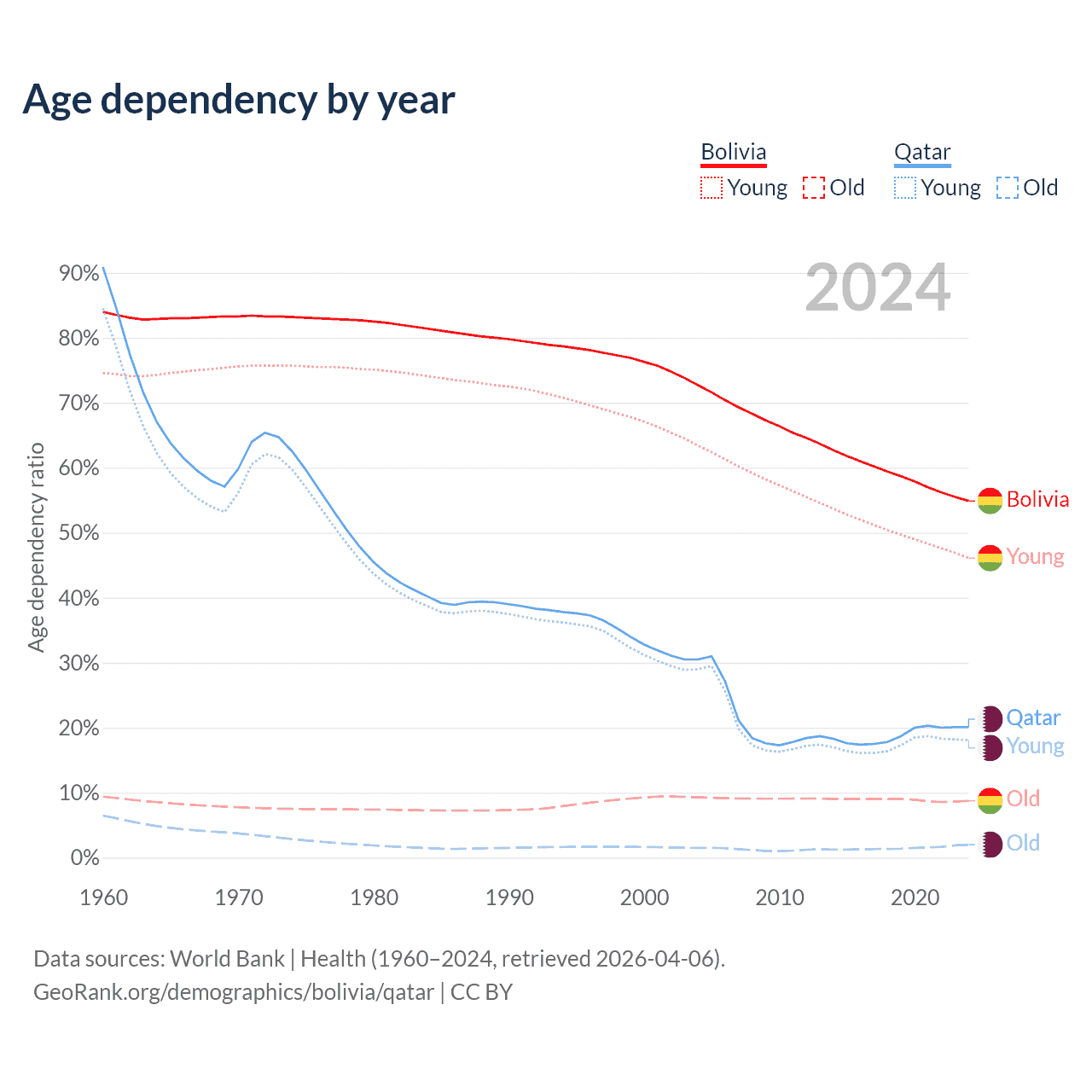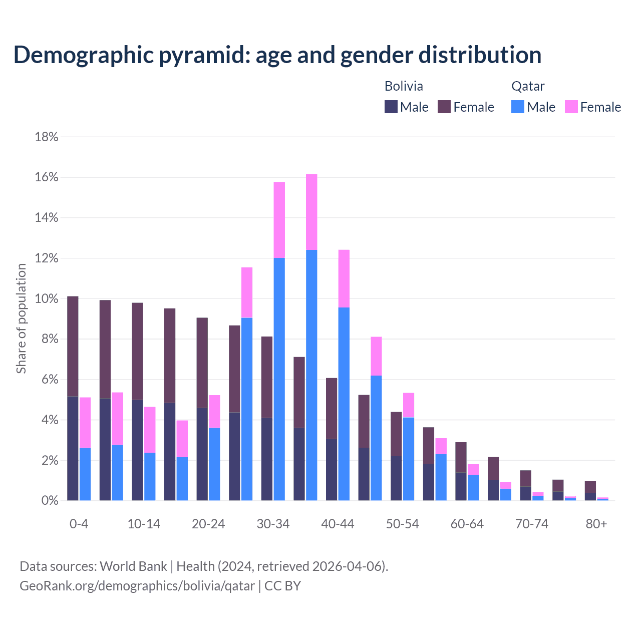 - The share of old-age demographic (65+) in Bolivia is 5.64% vs 1.68% in Qatar.