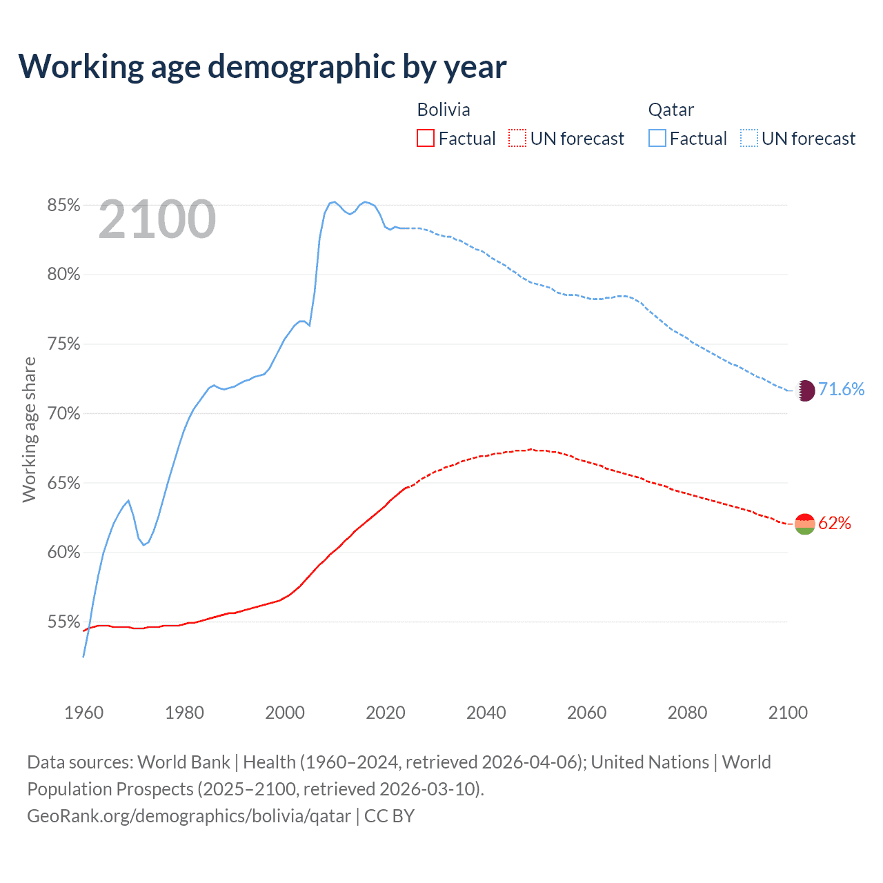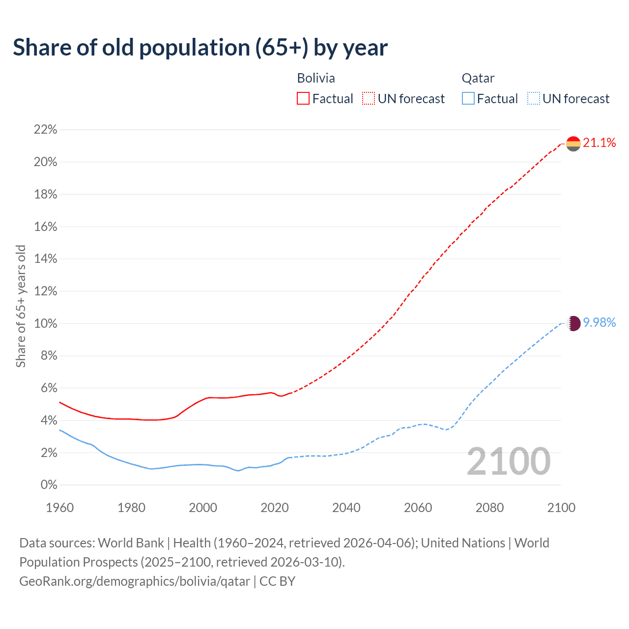 The share of older people aged 65 and over is 5.64% in Bolivia and 1.68% in Qatar. Life expectancy in Bolivia compared to Qatar .
