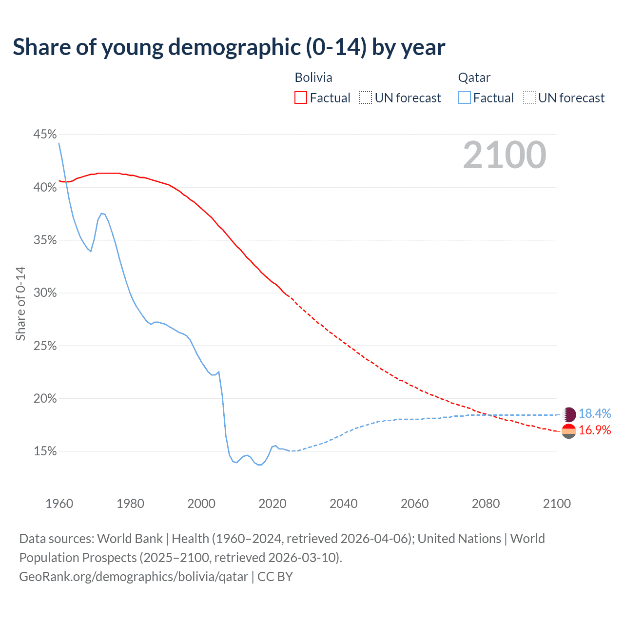 - The share of young demographic (0-15 years old) in Bolivia is 29.8% vs 15.1% in Qatar.