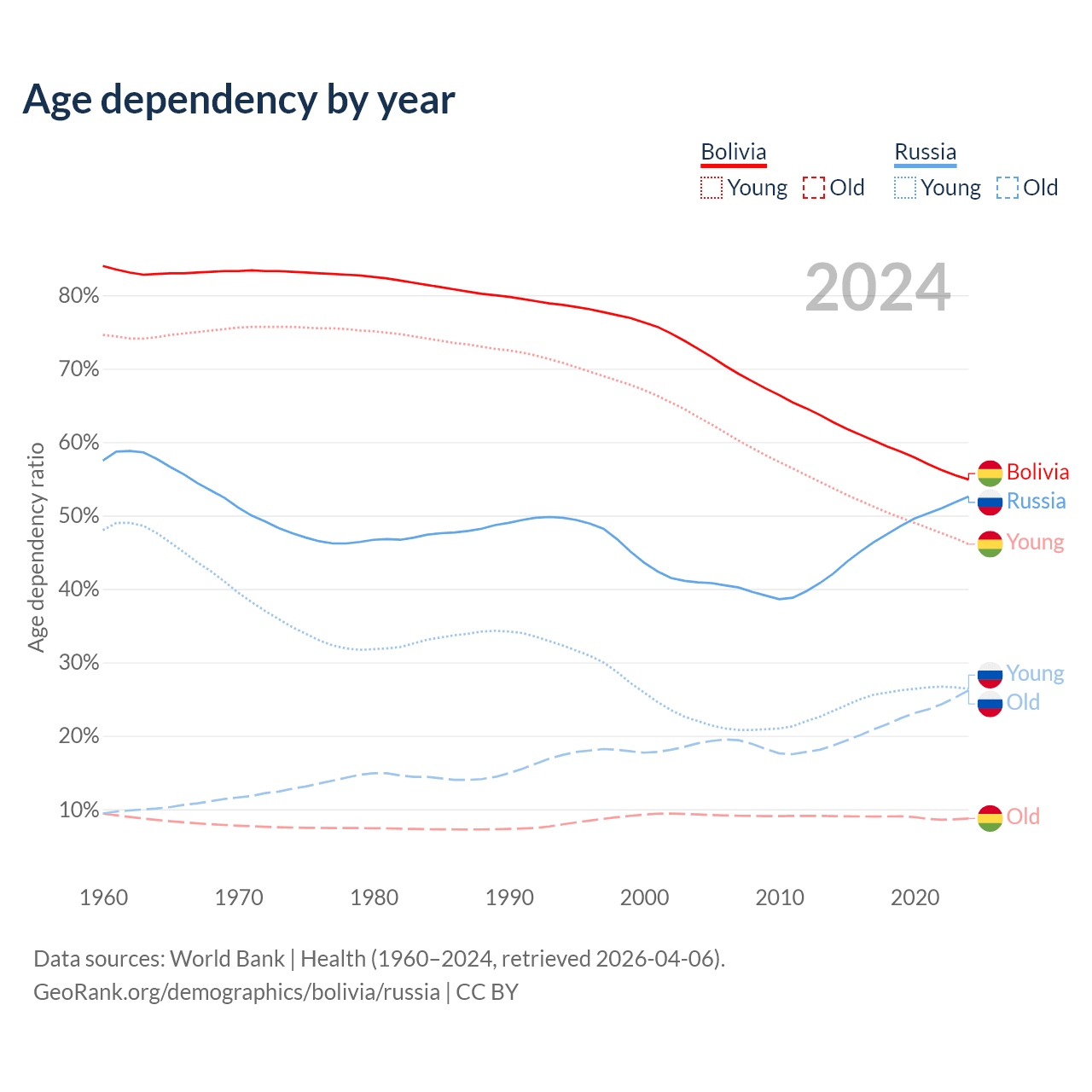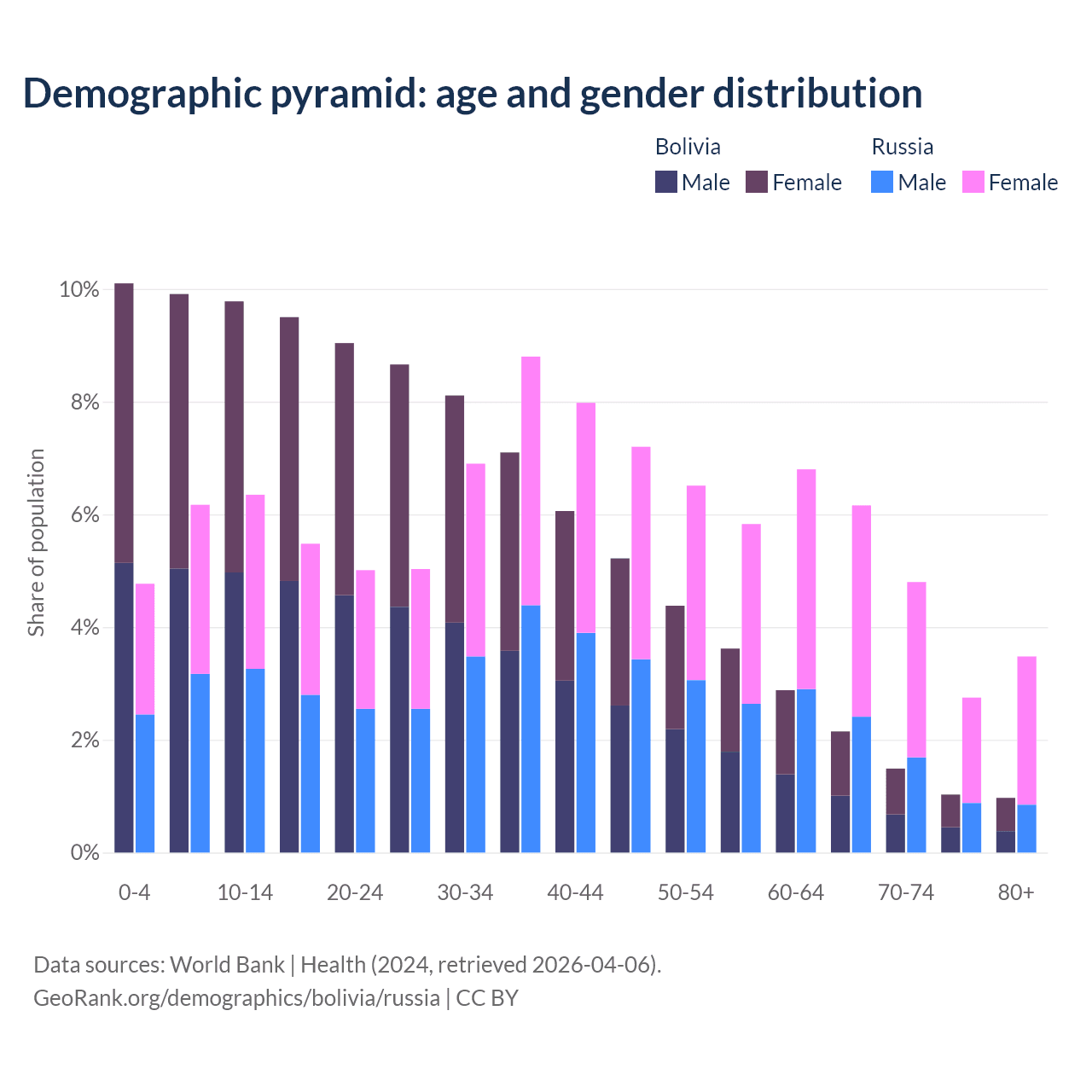 - Bolivia is ranked 128/196 by median age (oldest to youngest) vs 42/196 for Russia.