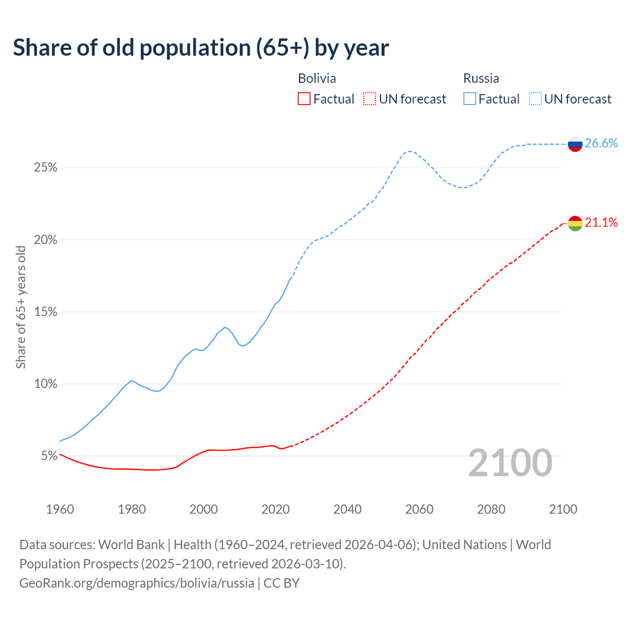 The share of older people aged 65 and over is 5.64% in Bolivia and 17.2% in Russia. Life expectancy in Bolivia compared to Russia .