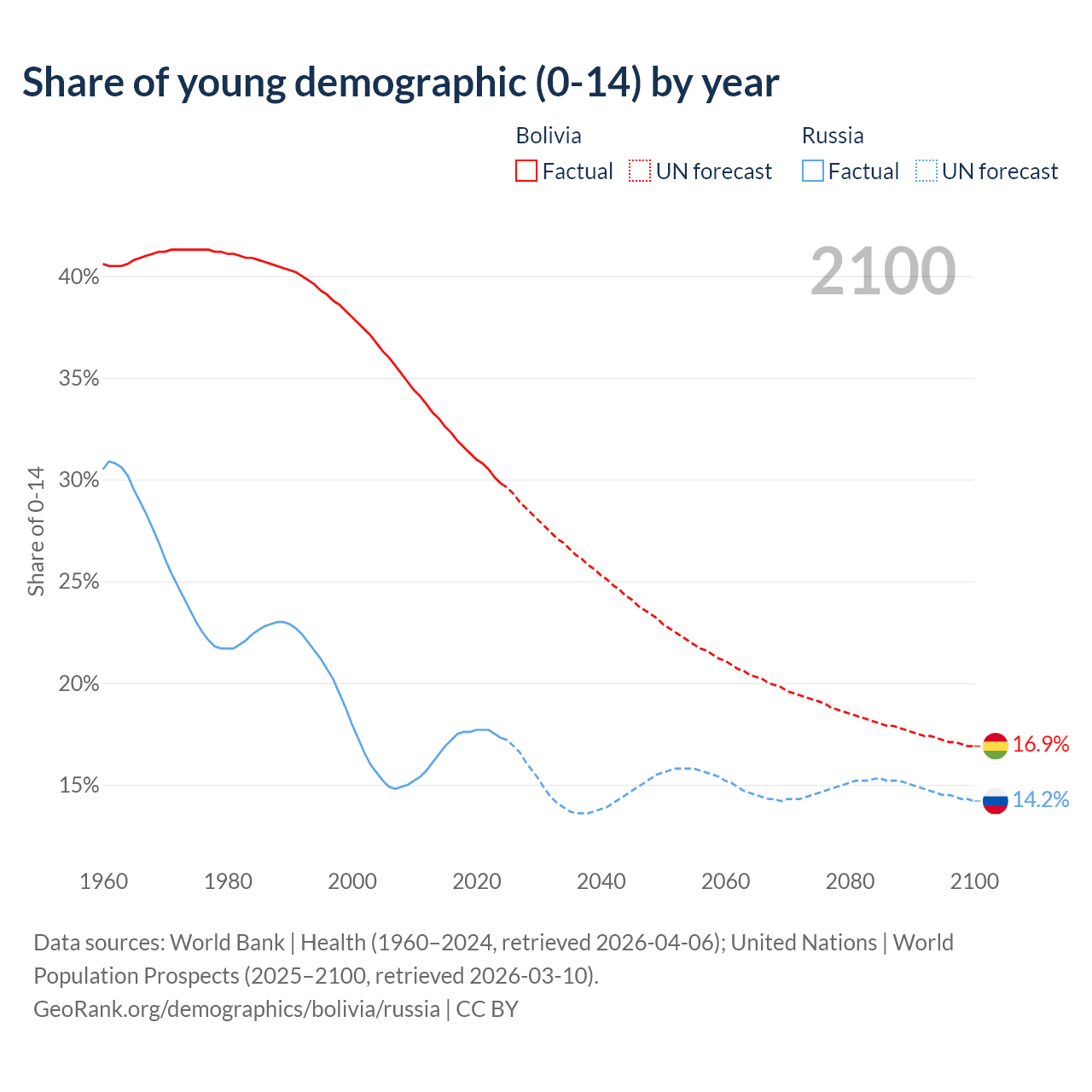 - The share of young demographic (0-15 years old) in Bolivia is 29.8% vs 17.3% in Russia.