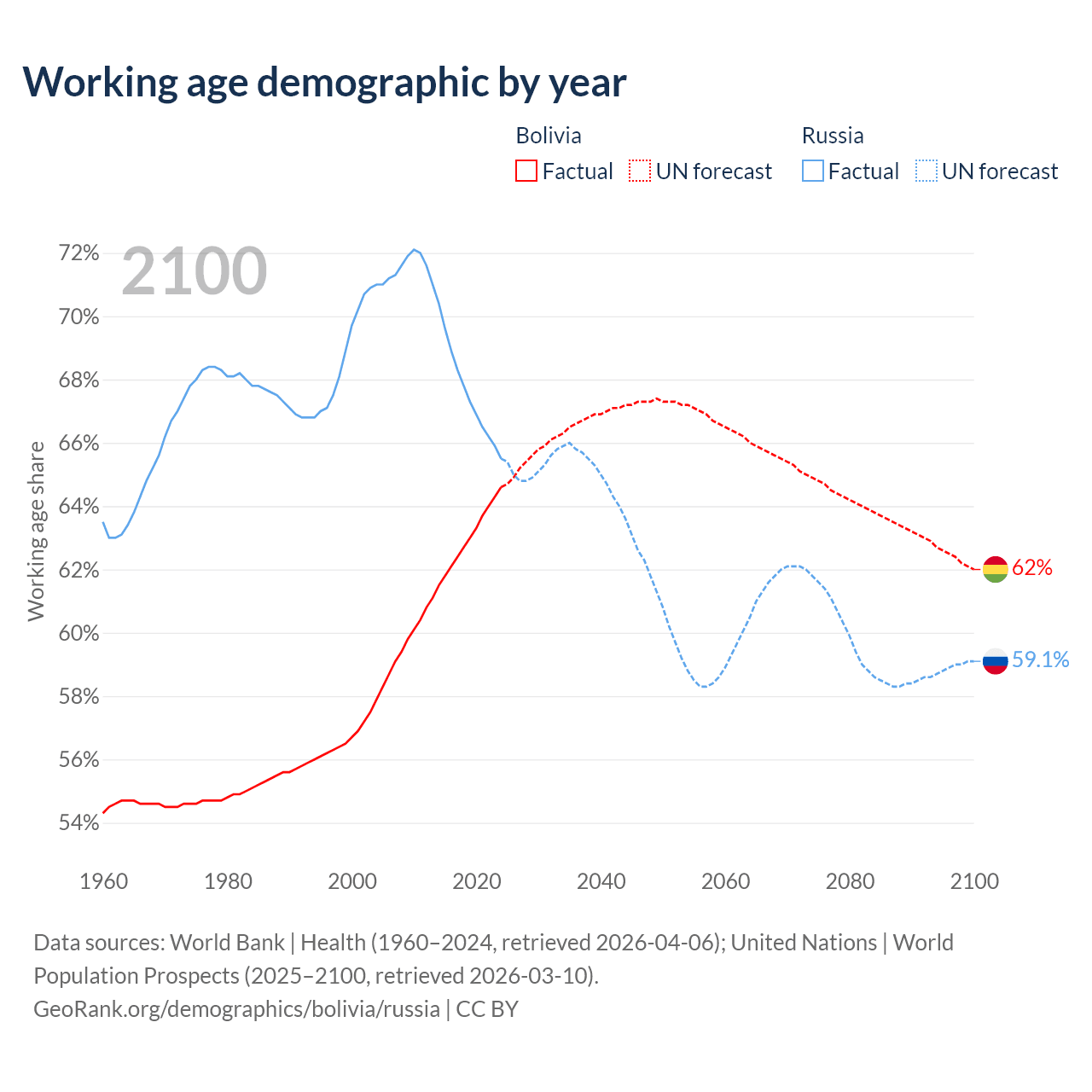 - Bolivia has 8.26M working age adults (aged 15-64) vs 93M in Russia.
