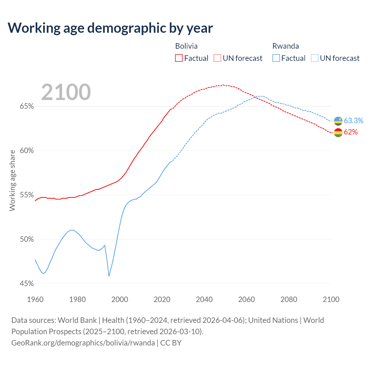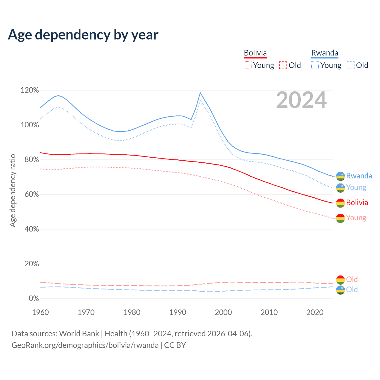 - The share of old-age demographic (65+) in Bolivia is 5.64% vs 3.93% in Rwanda.