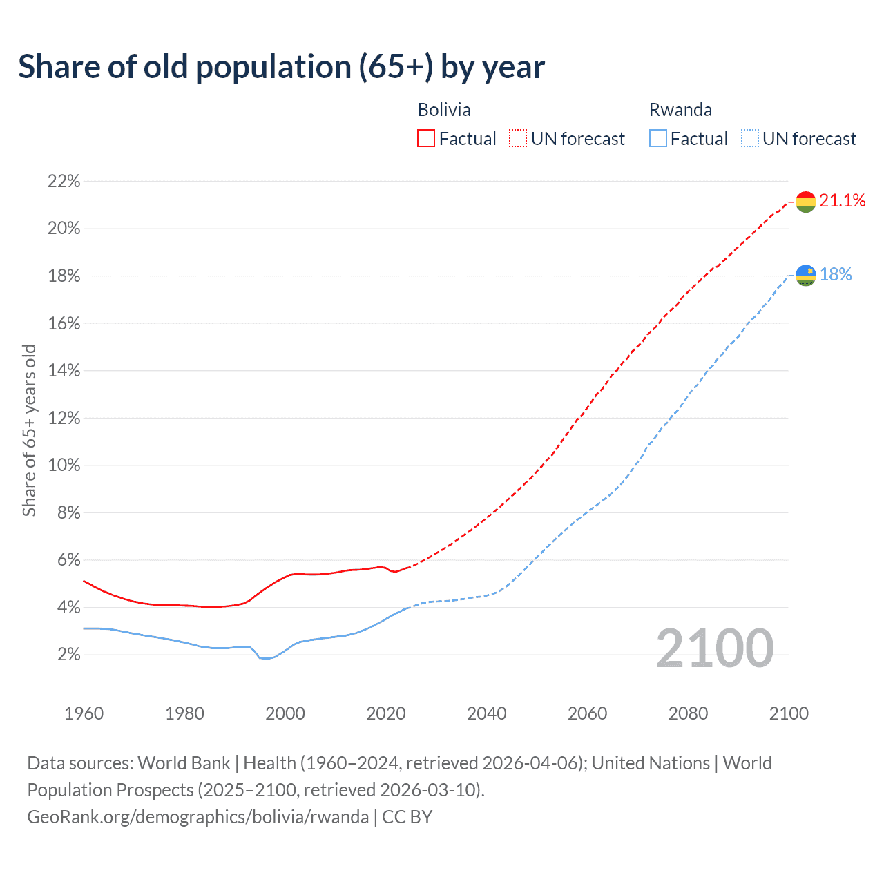 The share of older people aged 65 and over is 5.64% in Bolivia and 3.93% in Rwanda. Life expectancy in Bolivia compared to Rwanda .