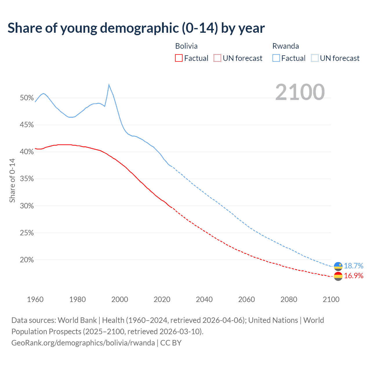 - The share of young demographic (0-15 years old) in Bolivia is 29.8% vs 37.4% in Rwanda.