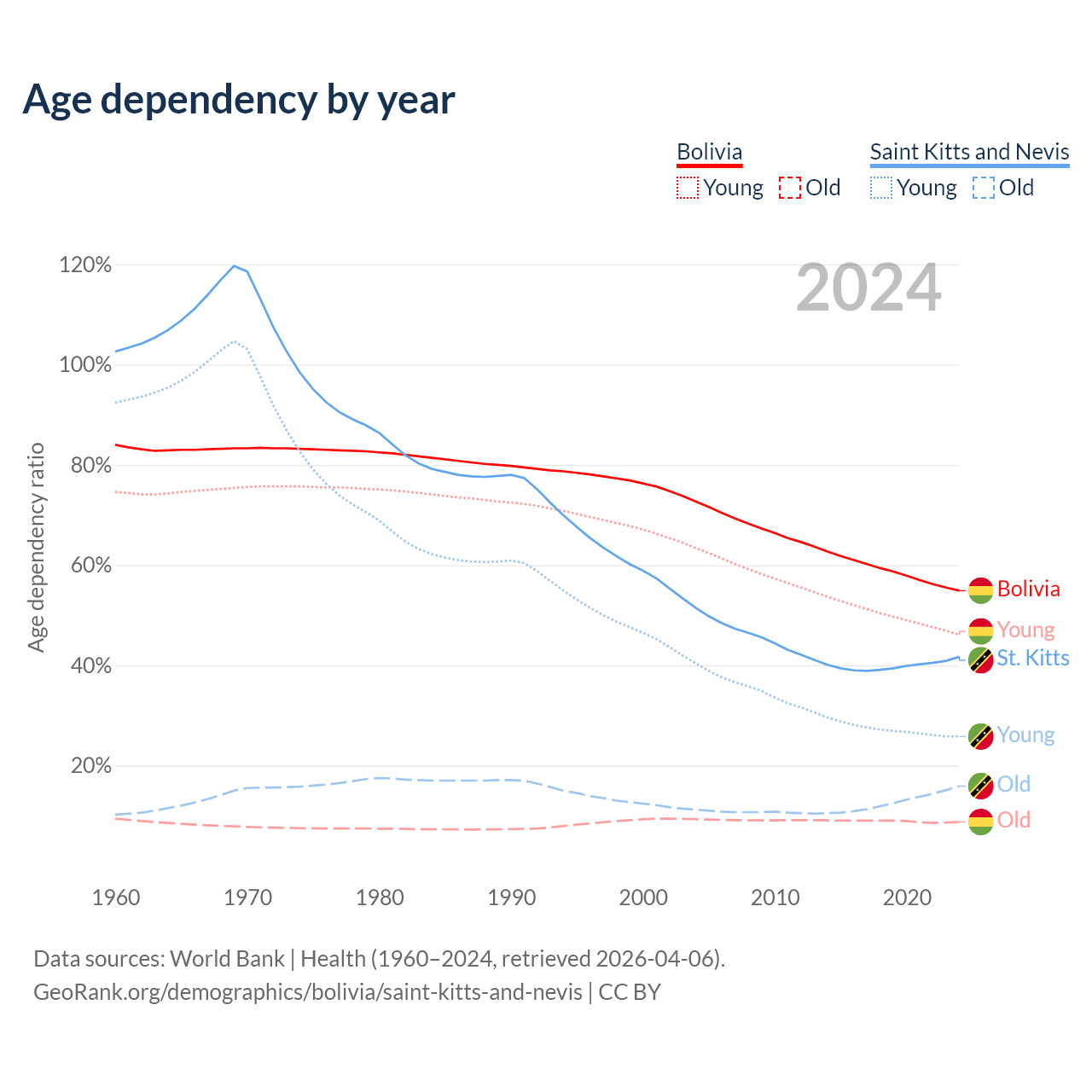- The share of old-age demographic (65+) in Bolivia is 5.64% vs 11.2% in Saint Kitts and Nevis.