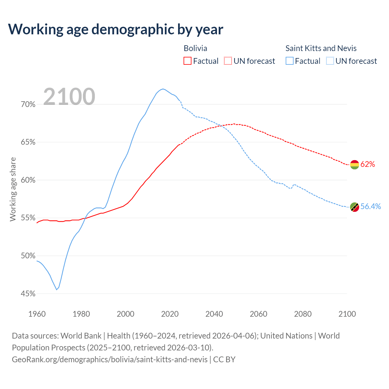 The share of older people aged 65 and over is 5.64% in Bolivia and 11.2% in Saint Kitts and Nevis. Life expectancy in Bolivia compared to Saint Kitts and Nevis .